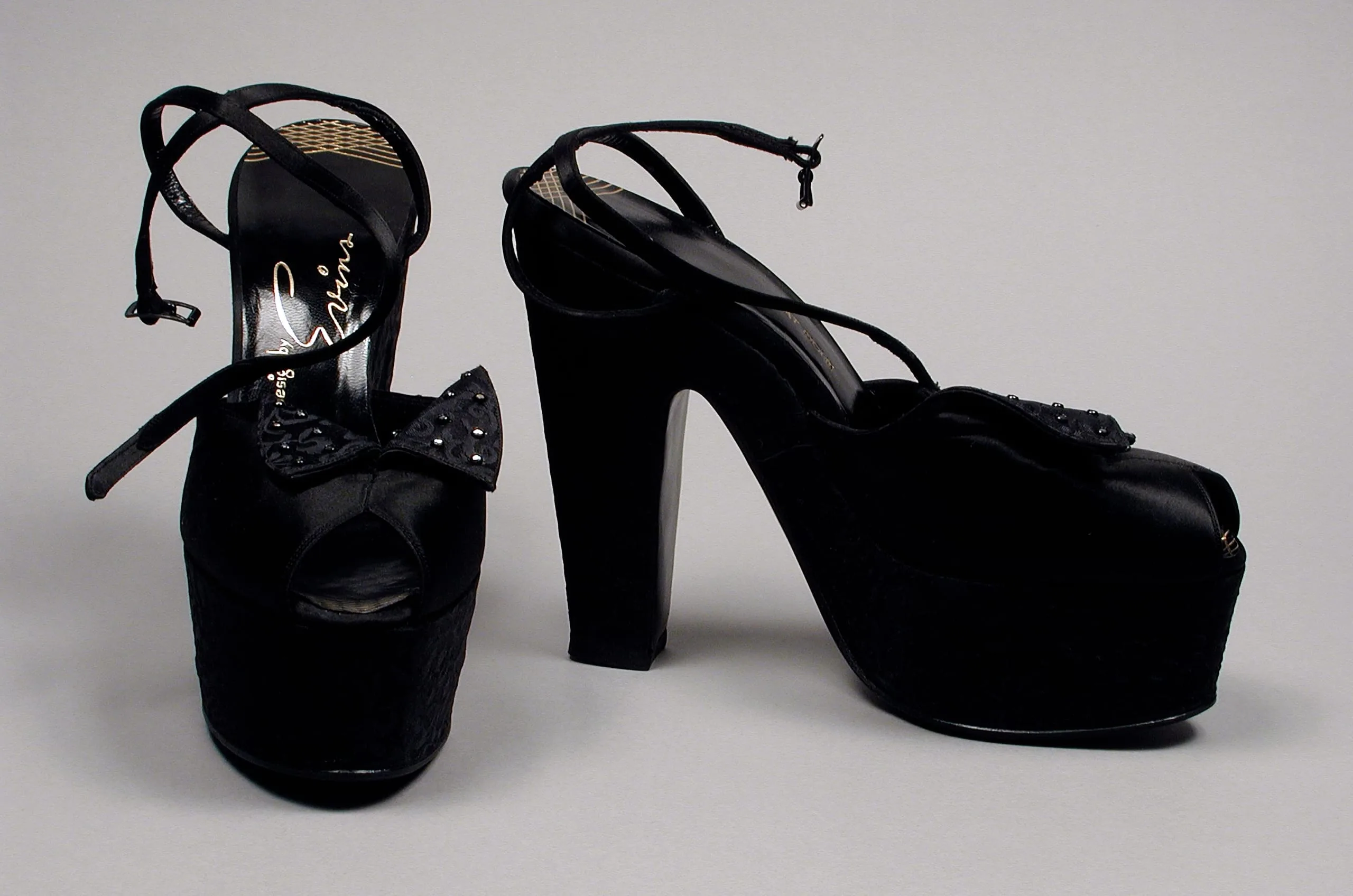 Pair of black satin platform high-heeled shoes with peep toes, crisscross ankle straps, chunky heels, and studded bow embellishments at the toe