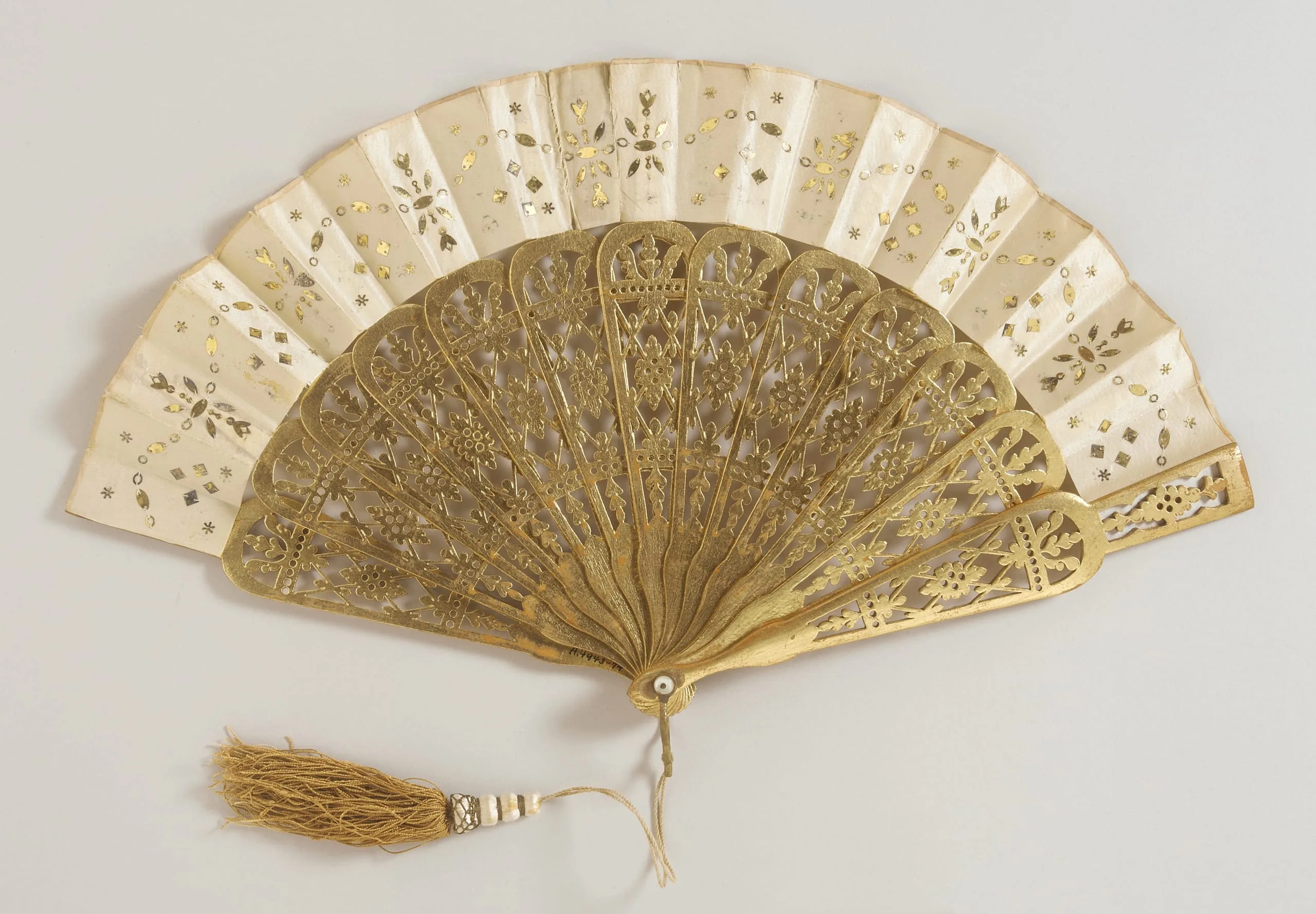 - Silk leaf with gold spangles, gold leaf and wood sticks, gold metallic loop, mother-of-pearl button, brass metallic rivet, silk and gold metallic tassel