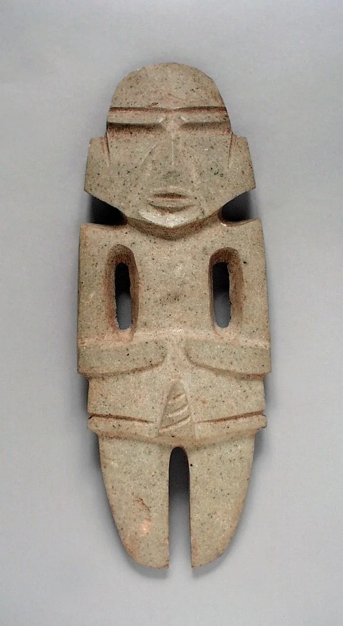 Small carved stone figure in sandy gray with incised reddish-brown lines, stylized human form with oval cut-through openings at arms and split legs