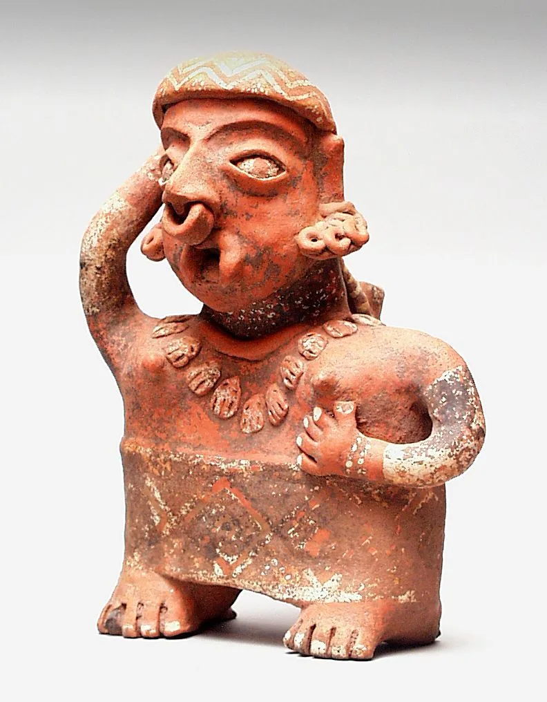 Small terracotta ceramic figurine of a seated humanoid figure with raised arm, incised geometric patterns, and applied necklace decoration, covered in orange-red slip with white encrustation