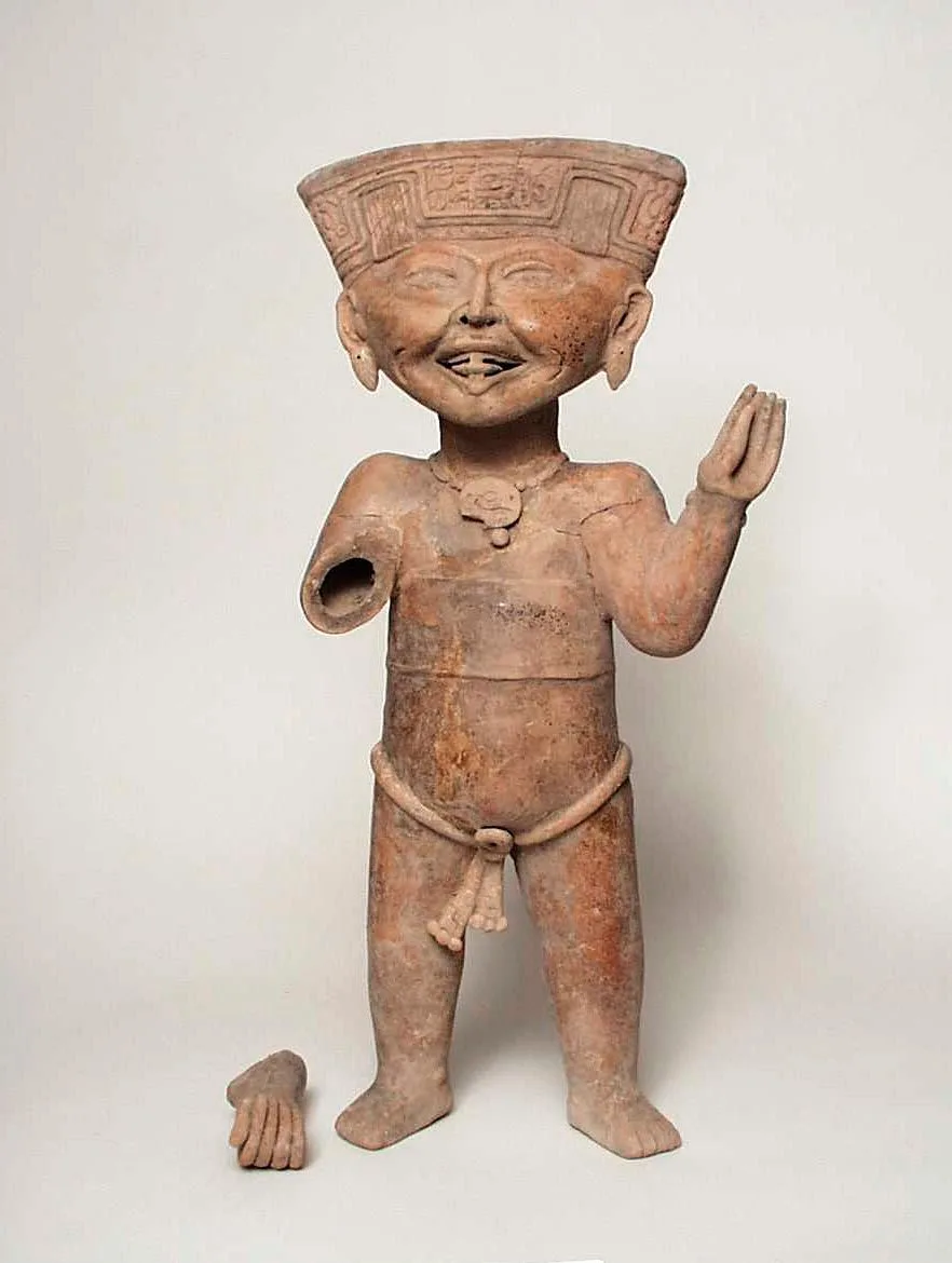 Terracotta standing figure with raised hand, wide grinning face, and large flared headdress decorated with incised geometric relief carving; a detached hand fragment rests nearby