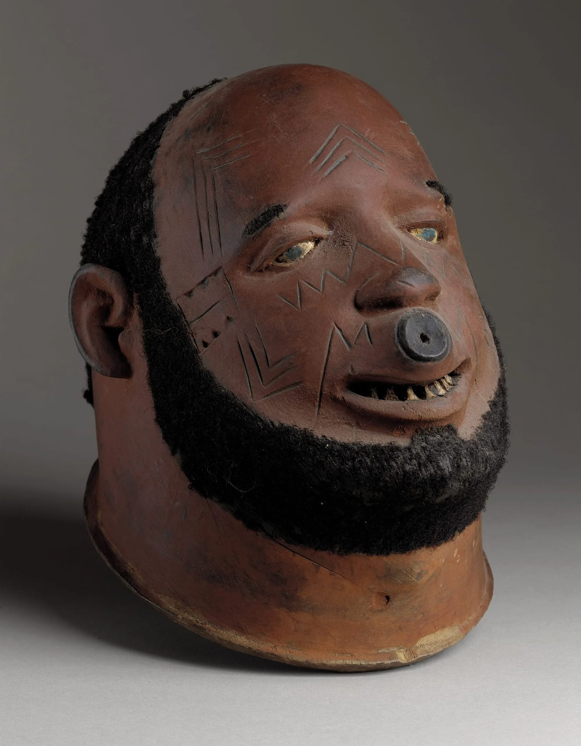 Ceramic head sculpture with terra-cotta surface, incised geometric facial markings, inlaid glass eyes, black fiber beard and hairline, and a circular nose ornament