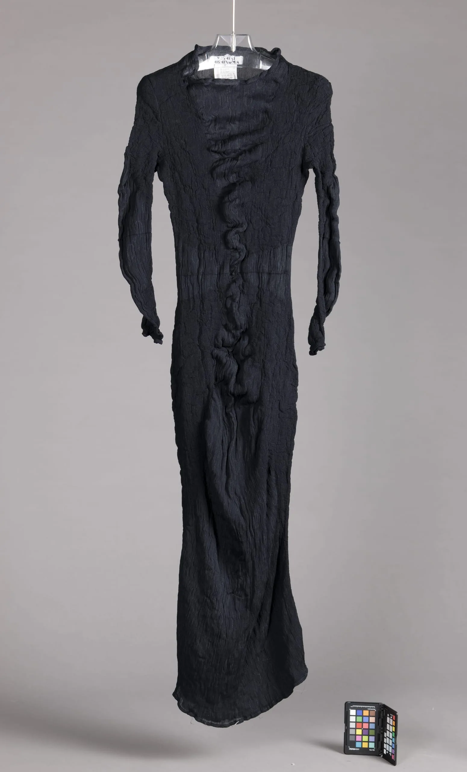 Long black dress on a clear hanger, full-length with long sleeves, heavily crinkled fabric surface, and a wavy ruffle running down the center front