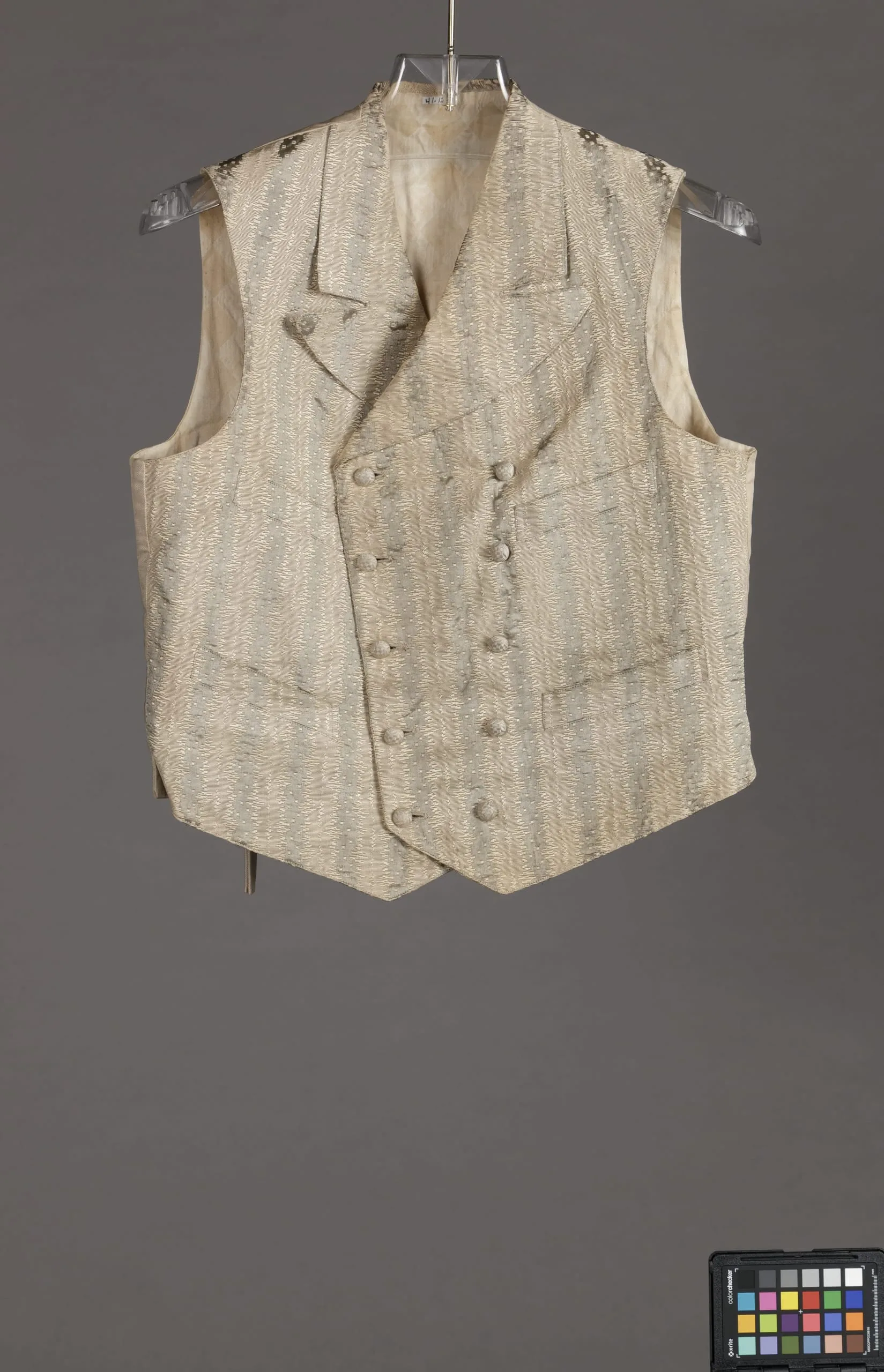 Men's double-breasted waistcoat in ivory fabric woven with allover silver metallic threads, with notched lapels, two welt pockets, and covered buttons, displayed on a clear hanger