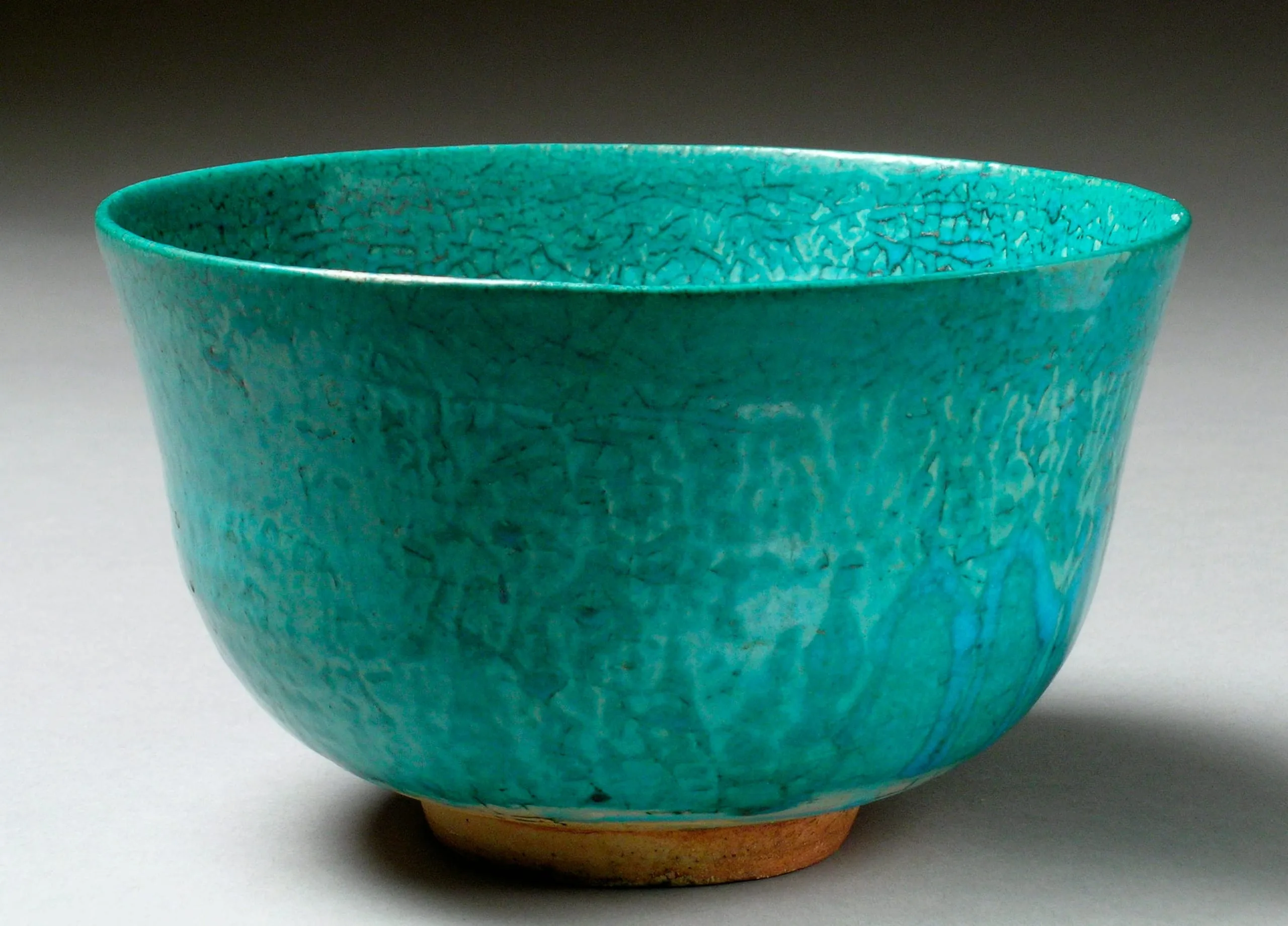 Ceramic bowl with rounded form, small foot ring, and vivid turquoise glaze covered in dense dark crazing across the entire surface