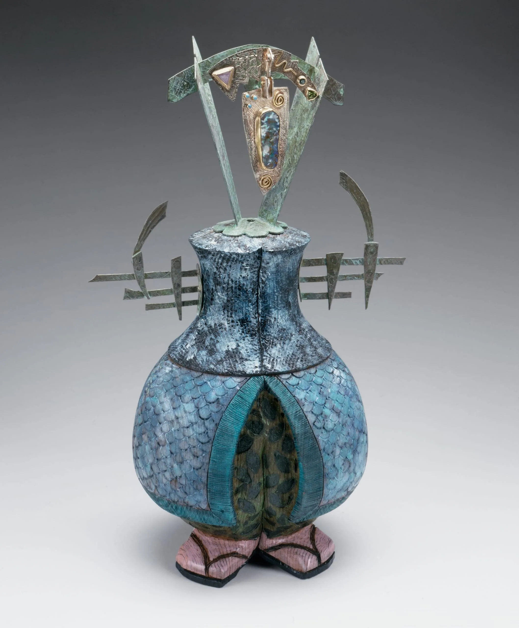 - Vessel: basswood, turned, carved, constructed, painted with oils; Armature: shibuichi; Brooch: sterling, 18 karat gold, Australian boulder opal, amethyst, blue topaz, peridot, turquoise