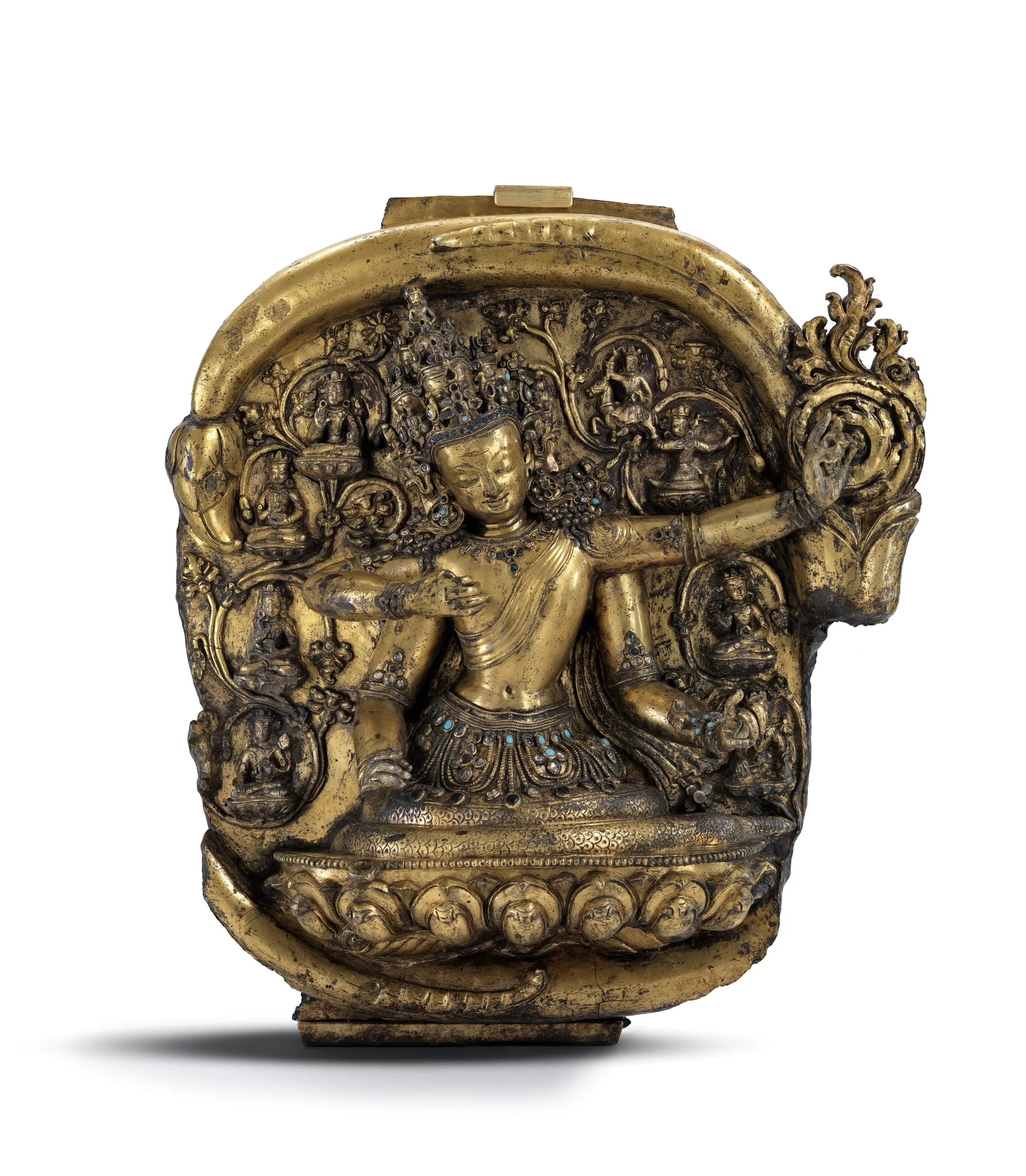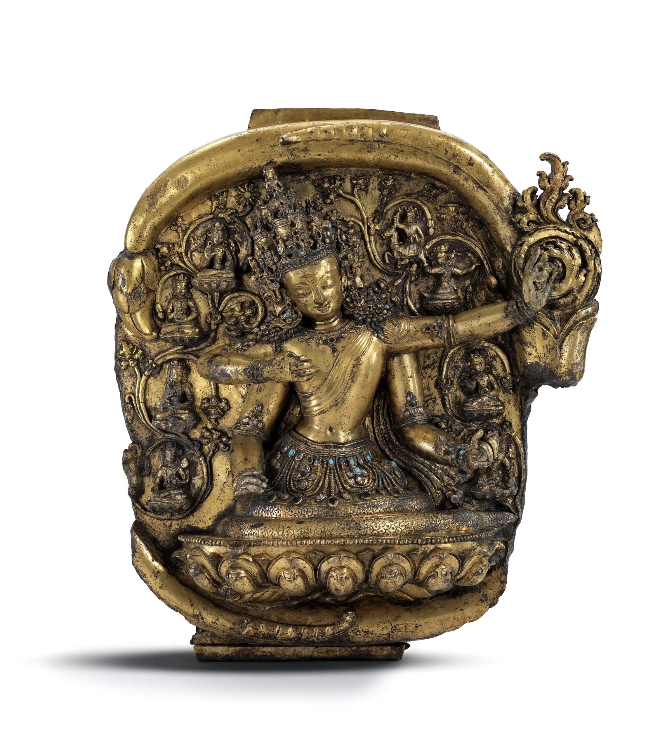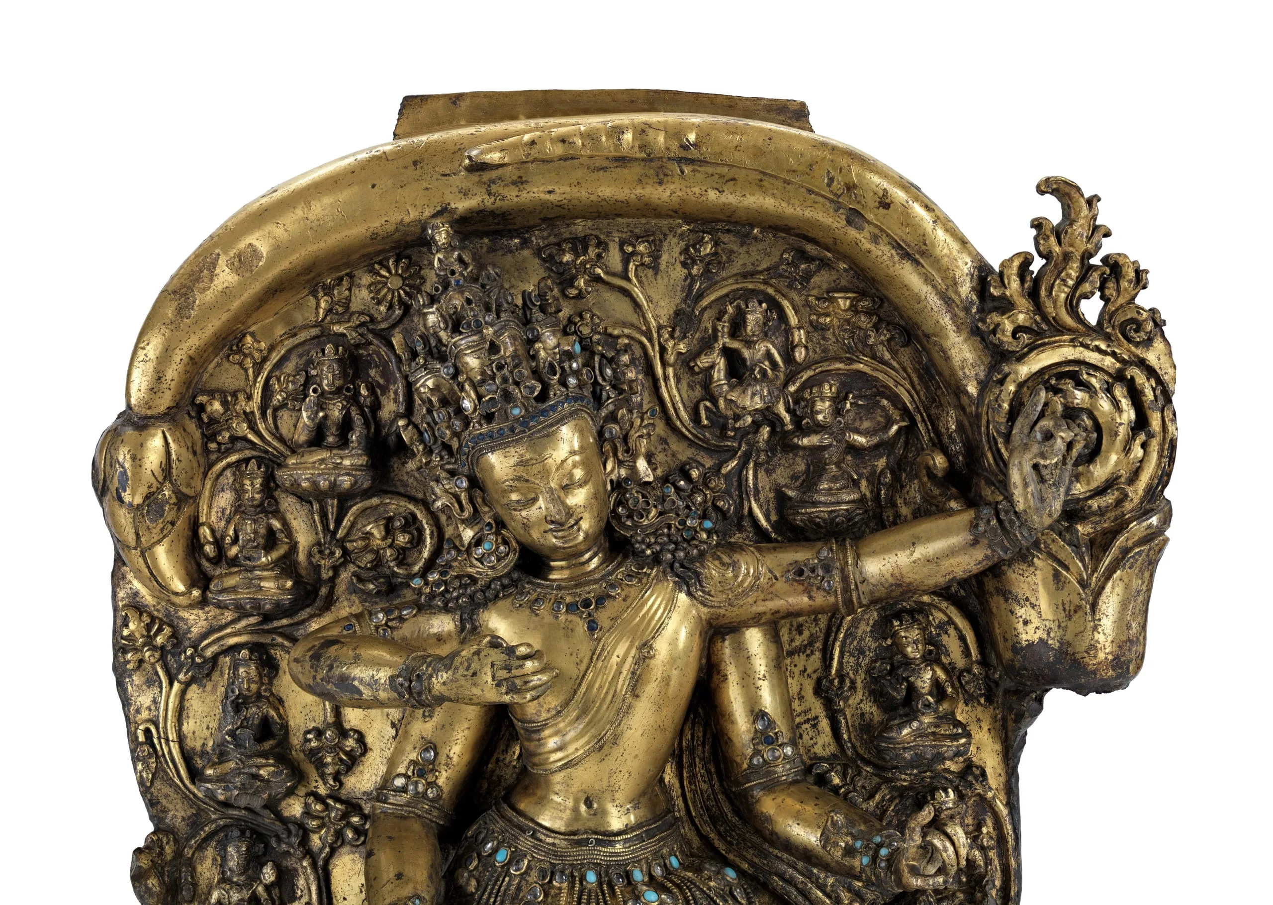 This relief is from the great stupa or funerary monument complex at the renowned Densatil monastery in central Tibet. Between 1198 and the early 17th century as many as eighteen stupas were erected at Densatil to either inter the remains of revered Kagyu Buddhist abbots and local princes or to honor their memory. The exteriors of the stupas were adorned with ornate high relief sculptures depicting various deities and subsidiary divinities. Each was encircled by a blossoming lotus tendril that united them in a coherent composition around the base of the monument. This sculpture is probably from one of the five stupas built between 1370 and 1431, most likely from one of the renowned stupas built under the patronage of the eminent Densatil abbot Sonam Gyaltsen (1386-1434). The Densatil monastic complex was destroyed during the Chinese Cultural Revolution between 1966 and 1976.