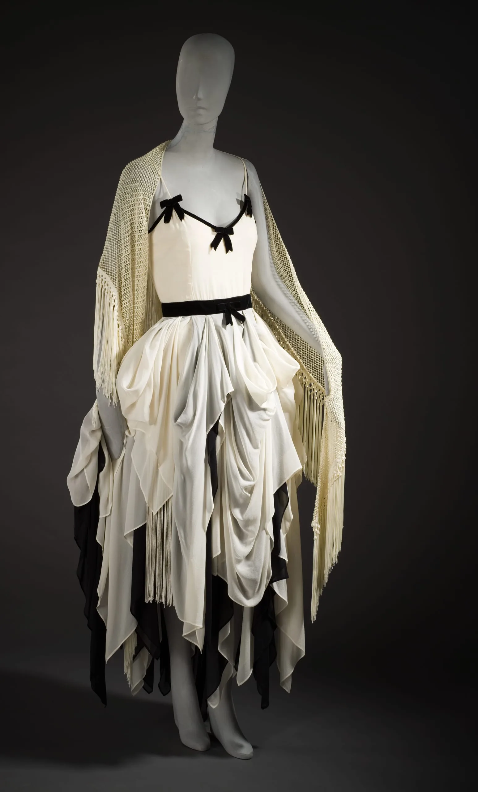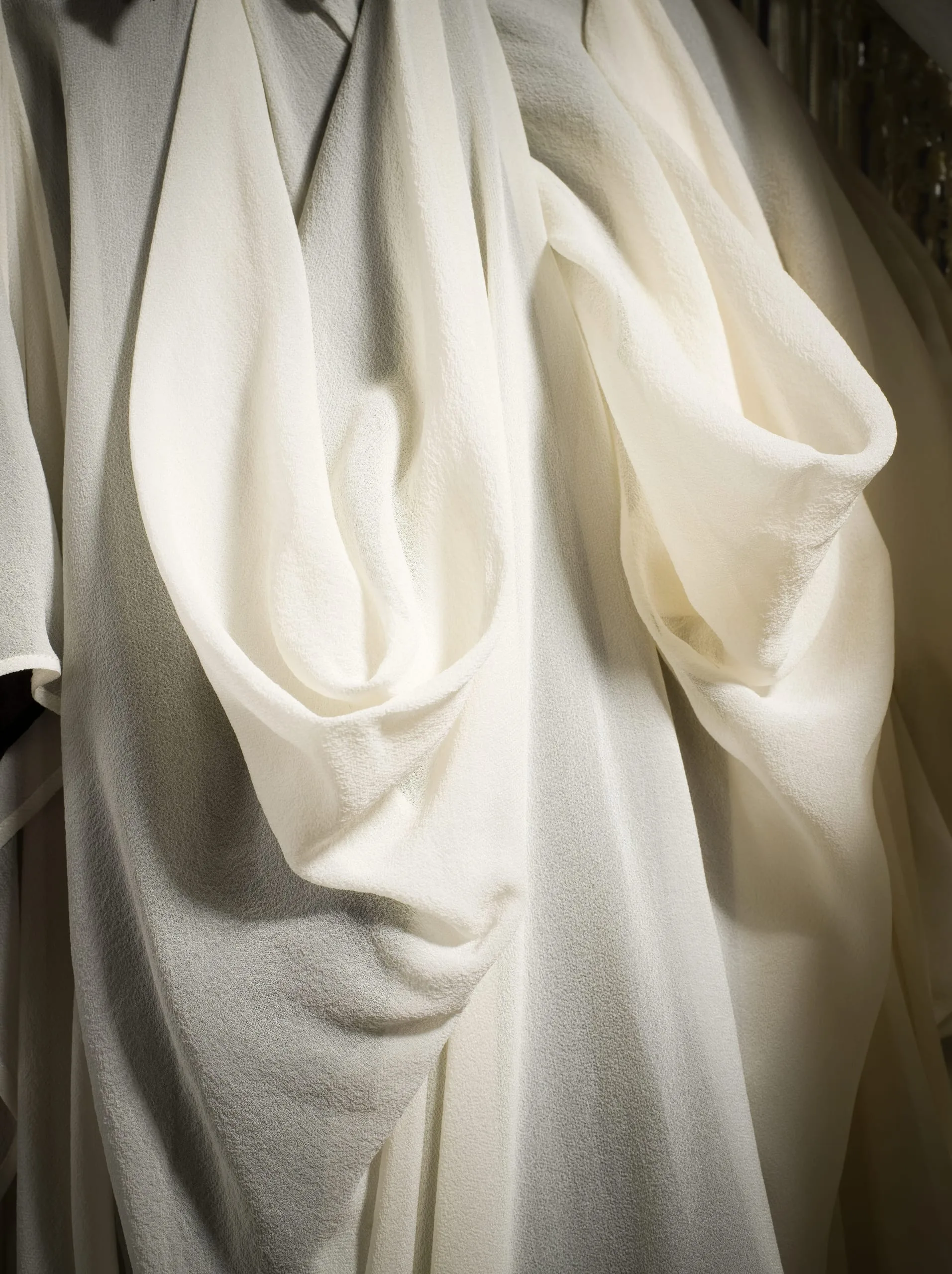 - Dress: Silk plain weave (crepe chiffon) and silk velvet