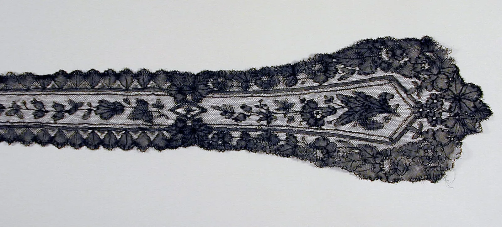 Long, narrow strip of black lace with floral and leaf motifs on a fine net ground, scalloped edges, tapering to a pointed decorative end