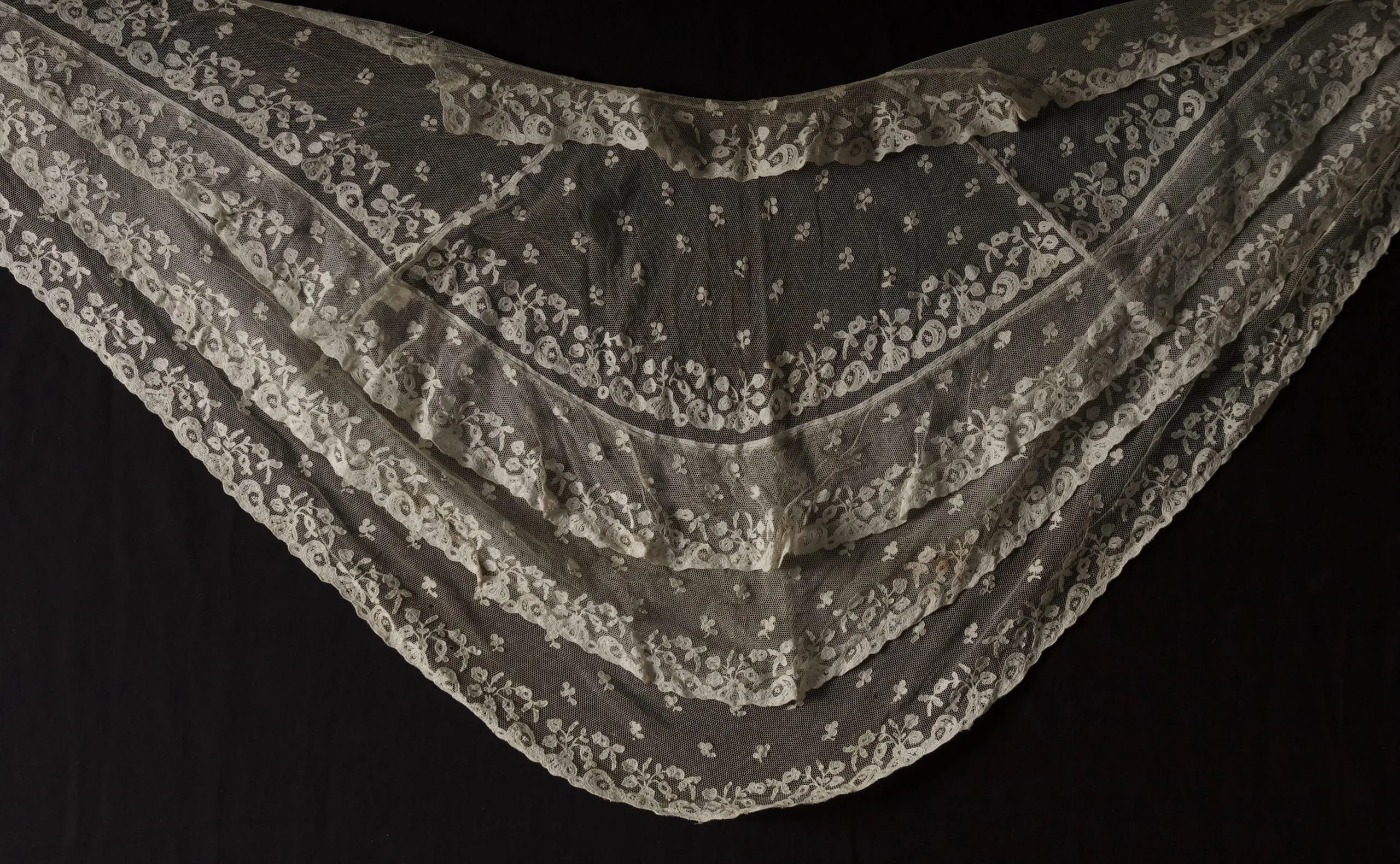 Large triangular sheer textile, possibly a veil or shawl, with ivory embroidered floral borders and scattered sprigs on a net ground, displayed against a black background