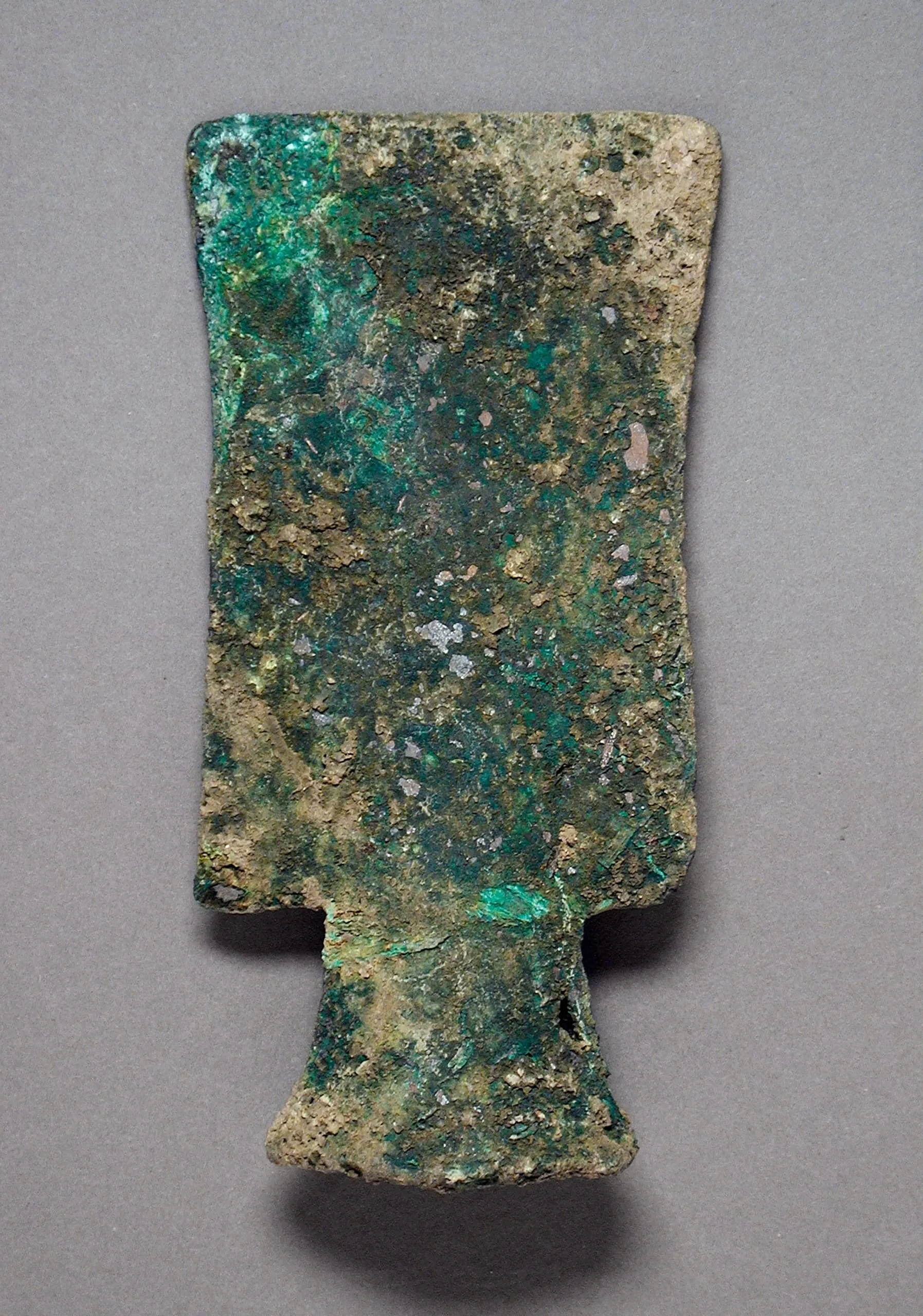 Heavily corroded bronze axe head with mottled teal and turquoise patina, rectangular body tapering to a narrow waist above a small flared foot