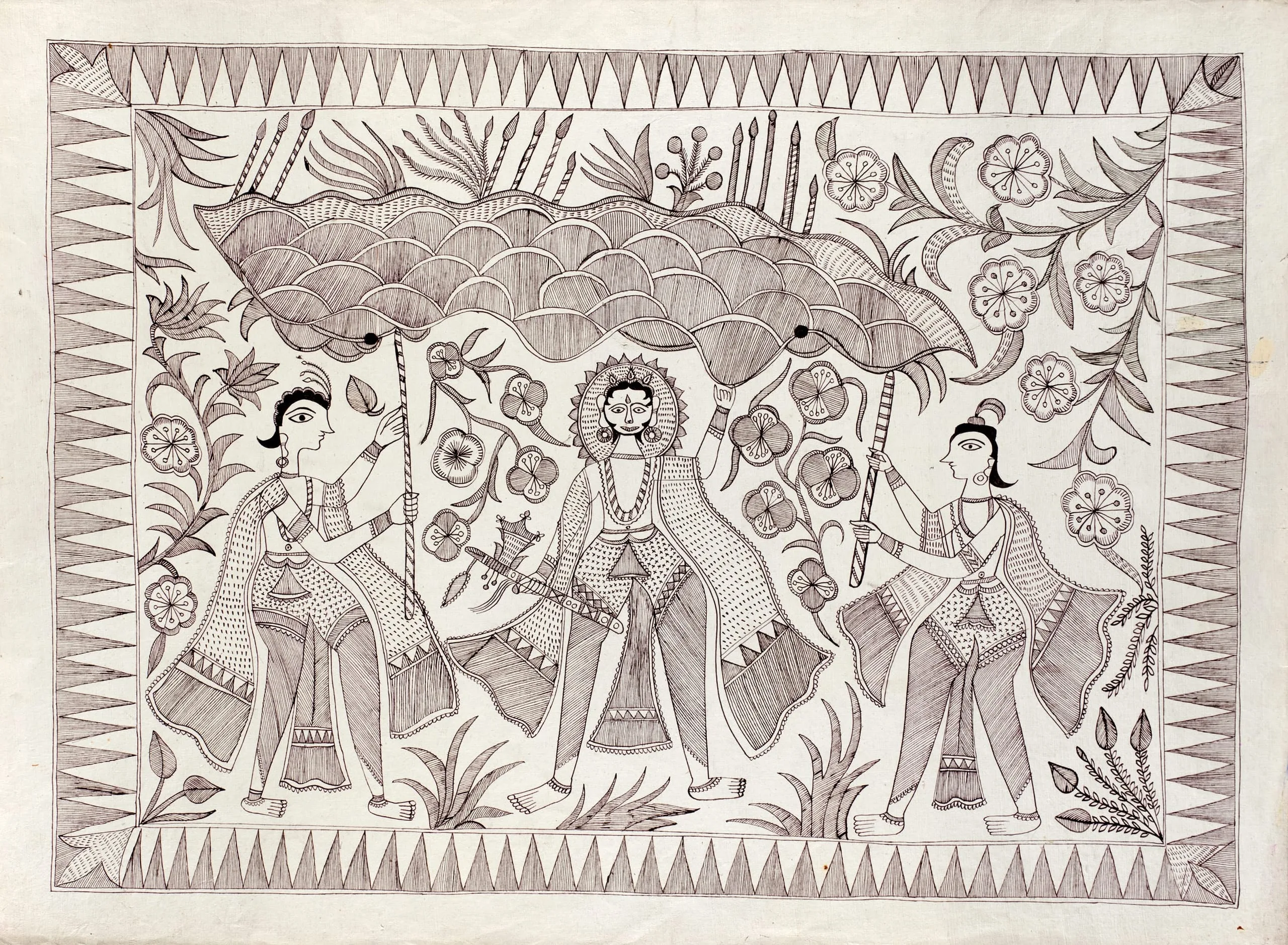 Madhubani or Mithila painting originated in northern Bihar, particularly in the village of Mithila in the Madhubani District, from which the art derived its modern names. Originally, these paintings, marked by their black outlines and striking color combinations, were executed on freshly plastered mud walls and floors of huts. They were collaborative efforts on the part of village women. The traditional imagery of these paintings concerns nature and fertility and is closely tied to events of ritual importance. Walls in family shrines were often painted, and the exterior walls of homes were decorated for weddings and festivals. For marriage celebrations, the nuptial chamber (kohbar ghar) was adorned with images having symbolic as well as auspicious properties.