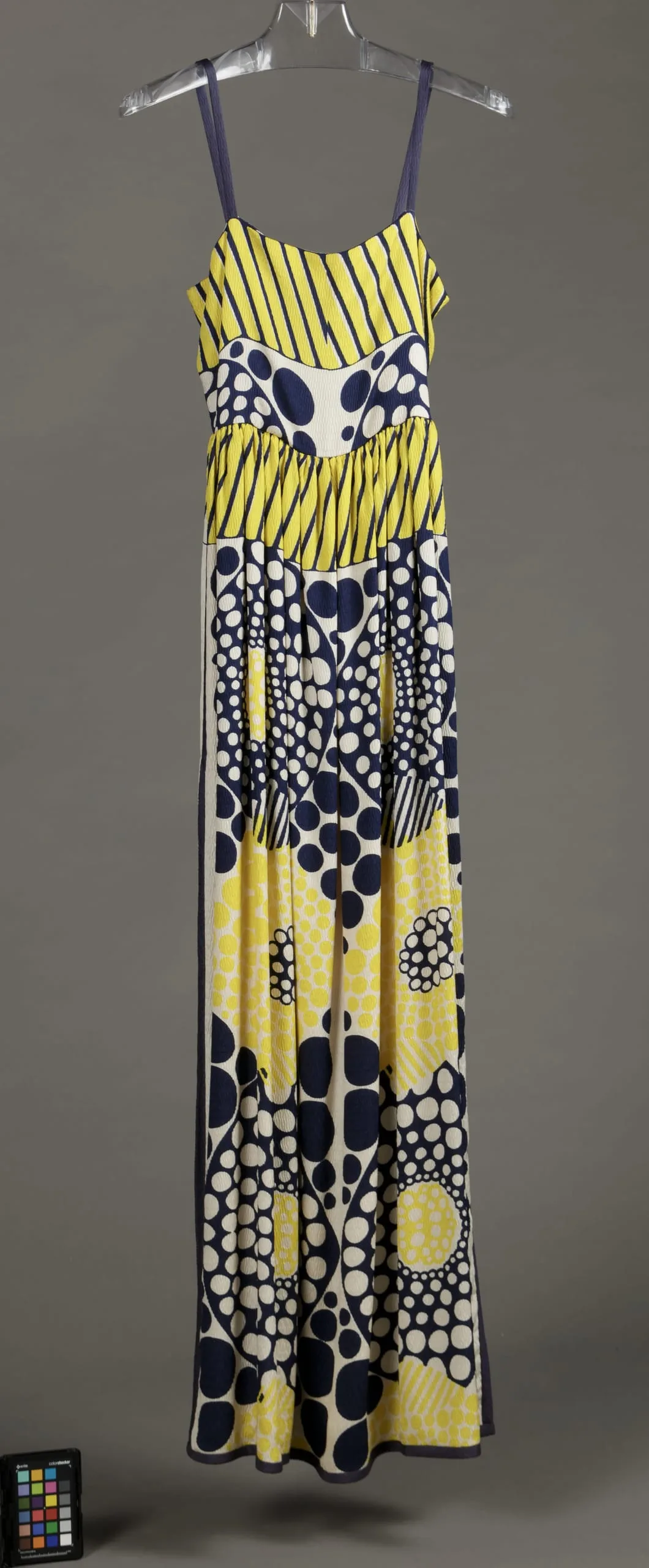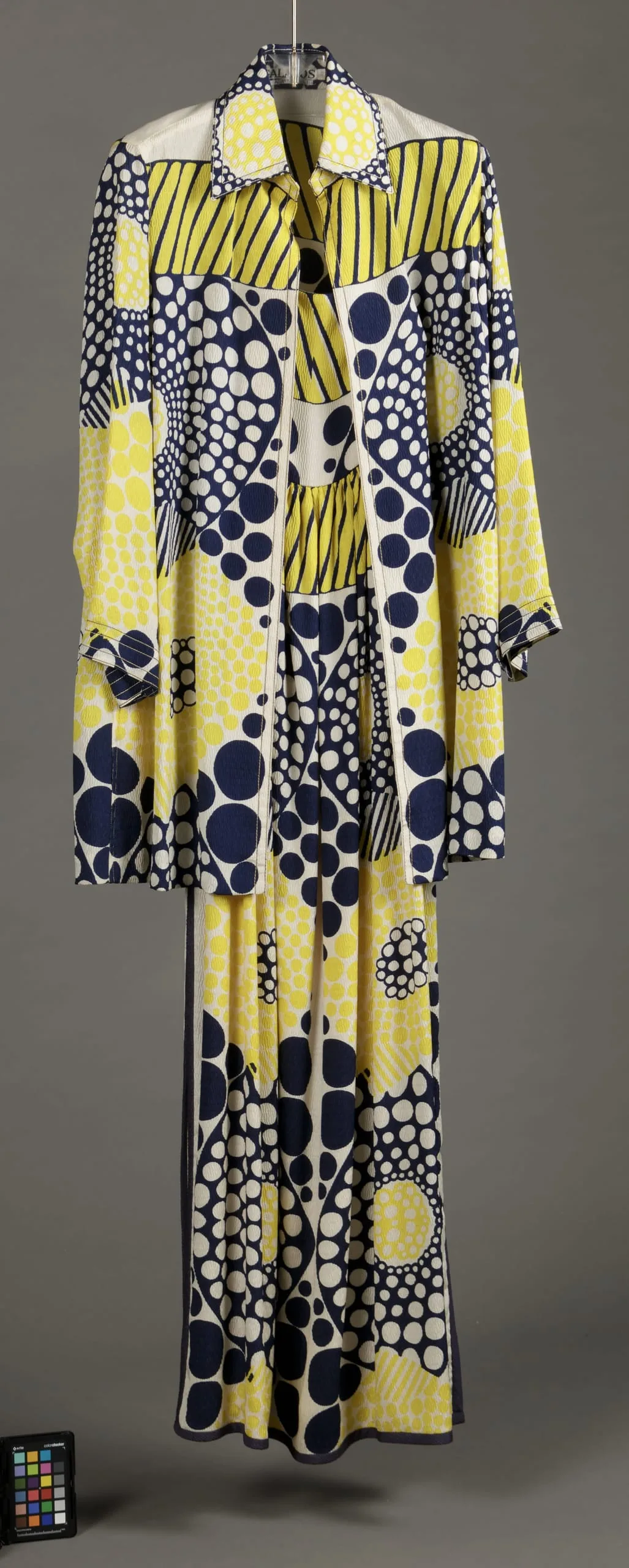 - Jacket and Dress: Silk plain weave with supplementary weft patterning (crepe effect), printed; Belt: Leather
