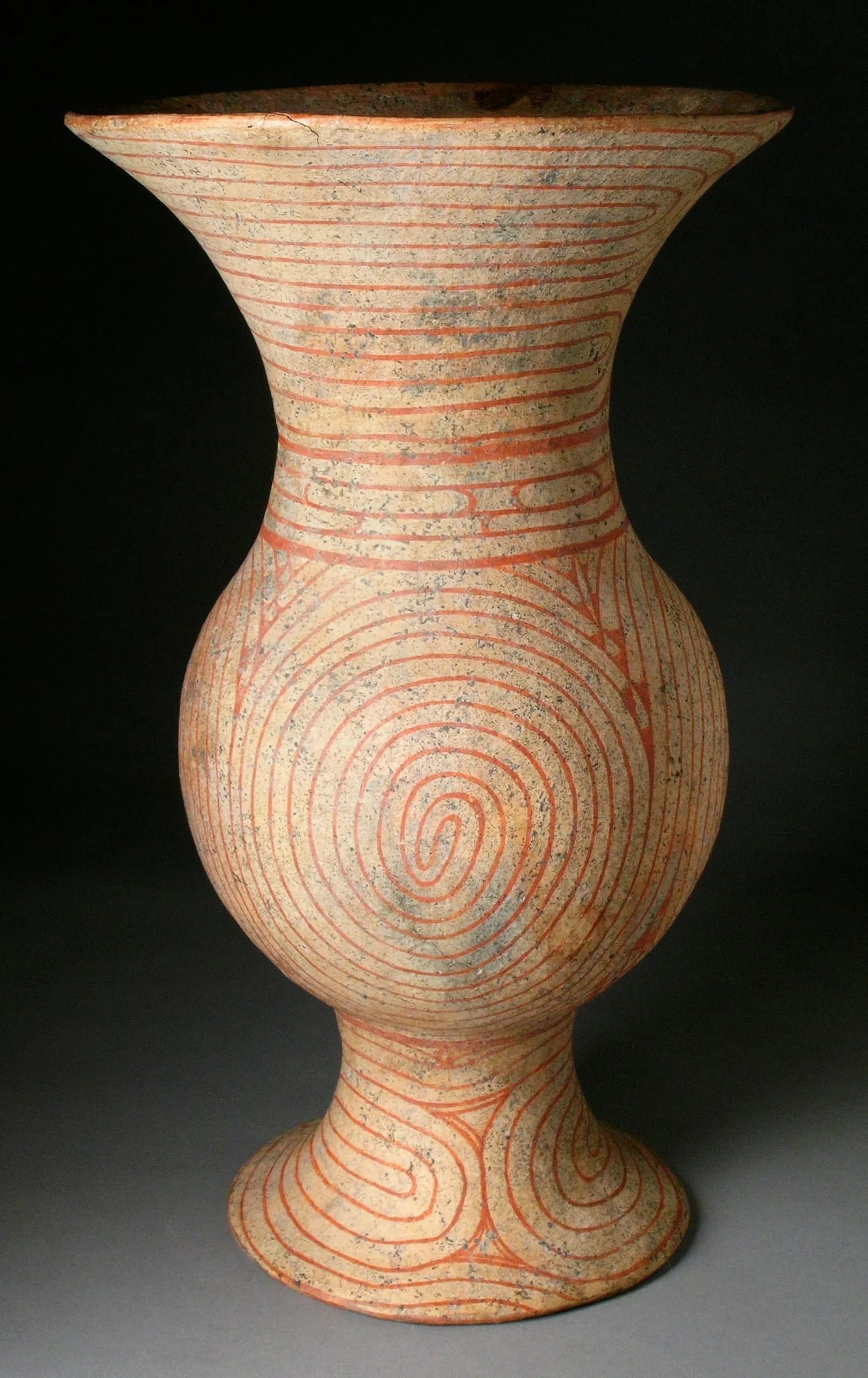 - Coil-built earthenware with cream slip and painted decoration