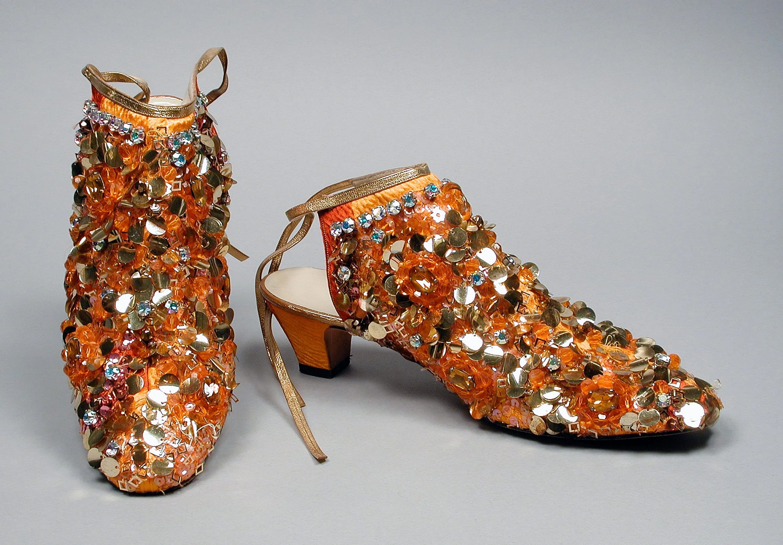 - Silk plain weave (crepe matelassé), printed, with plastic beads, plastic sequins, crystals, and leather