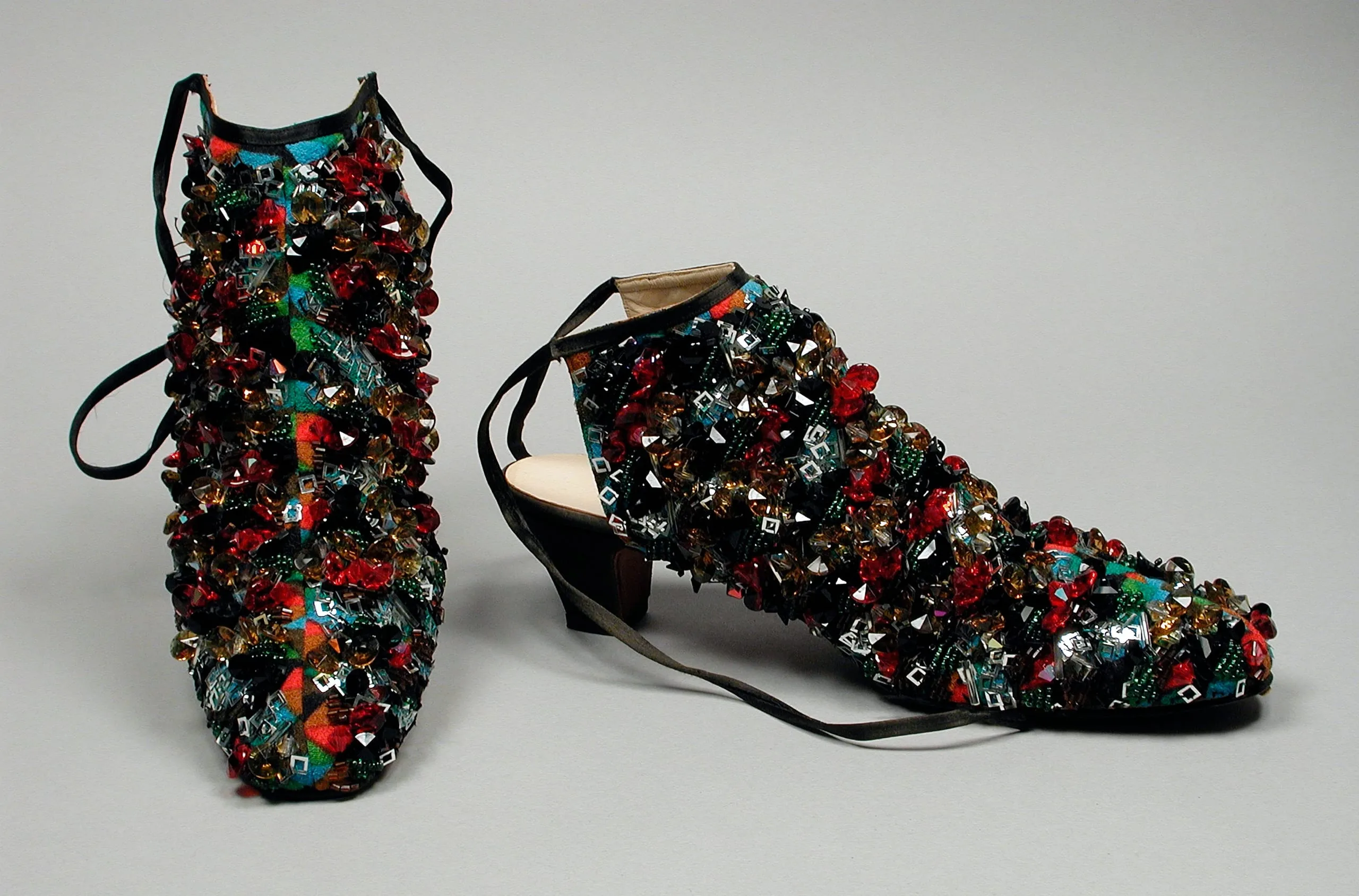 - Wool plain weave (crepe), printed, with plastic sequins, plastic beads, nylon satin, and leather