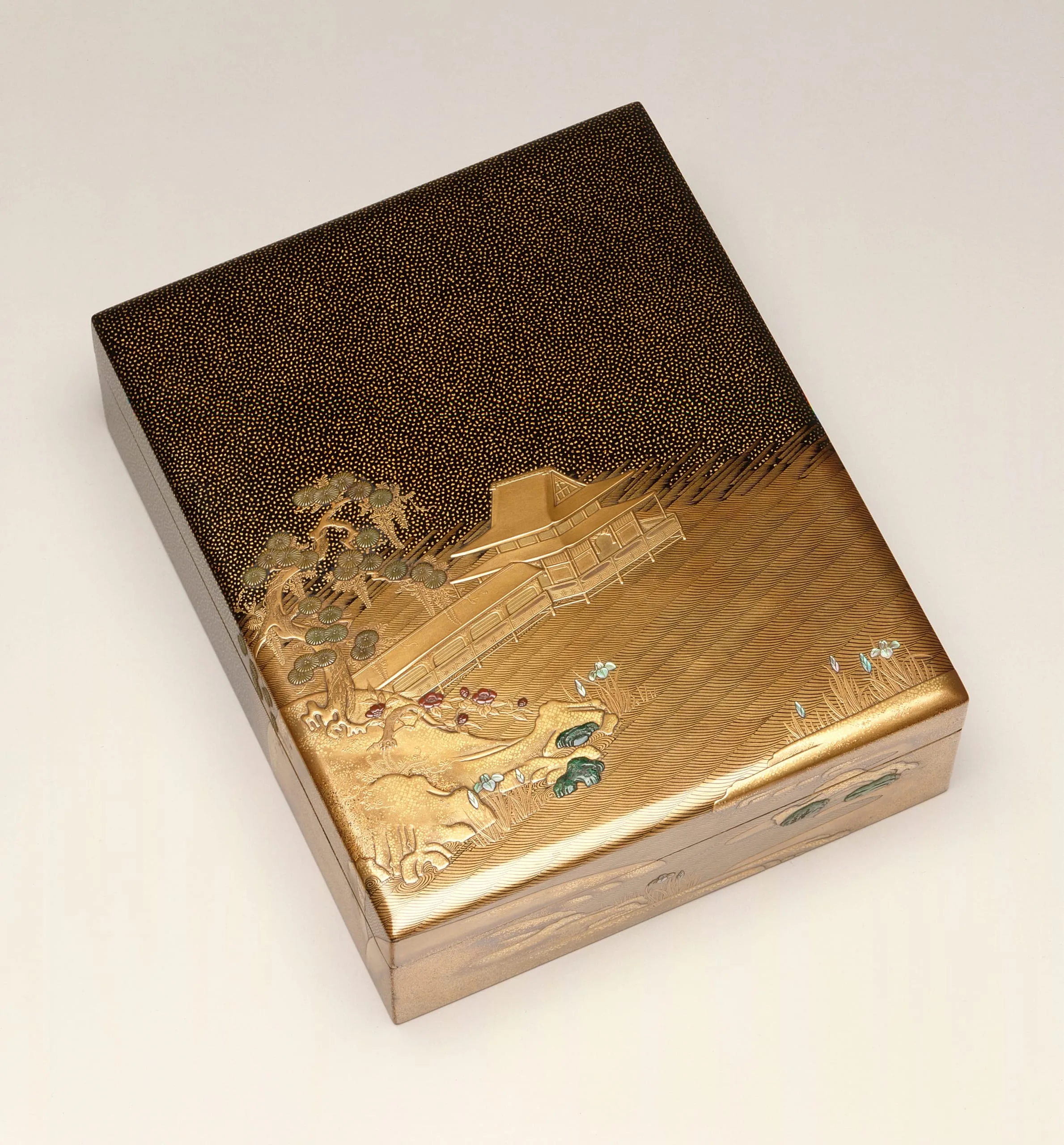 - Lacquered wood with inlays of mother-of-pearl, green stone, coral, tortoiseshell, wood, and metal