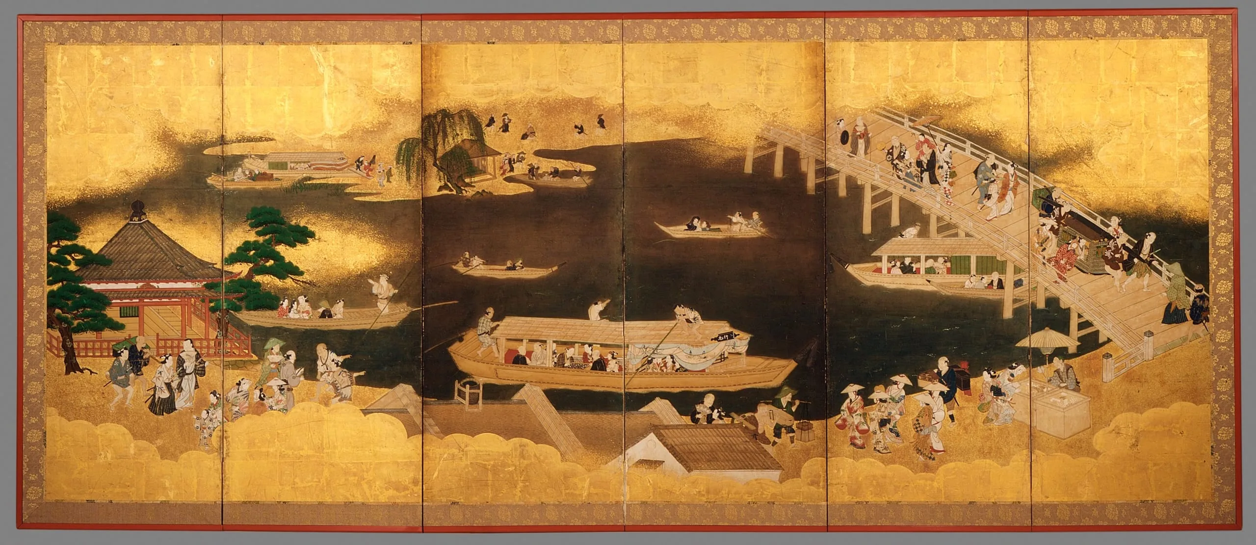 - Six panel screen; ink, colors, and gold on paper
