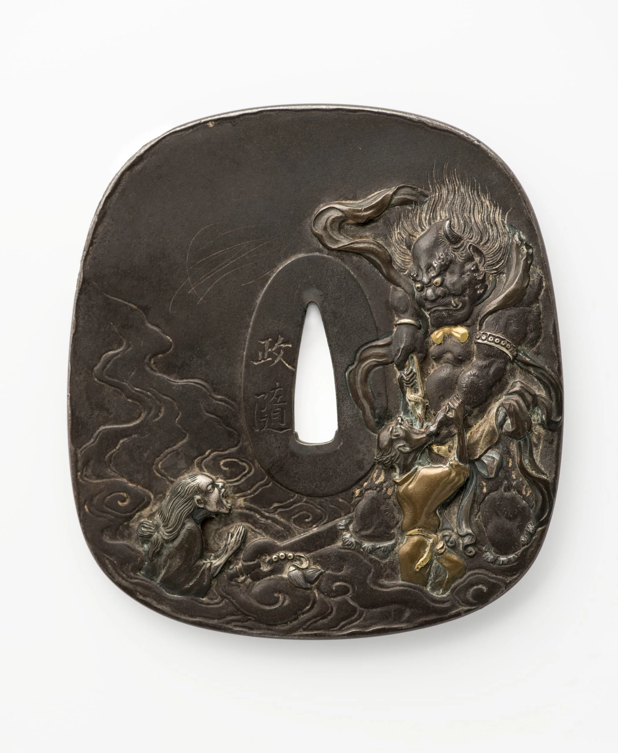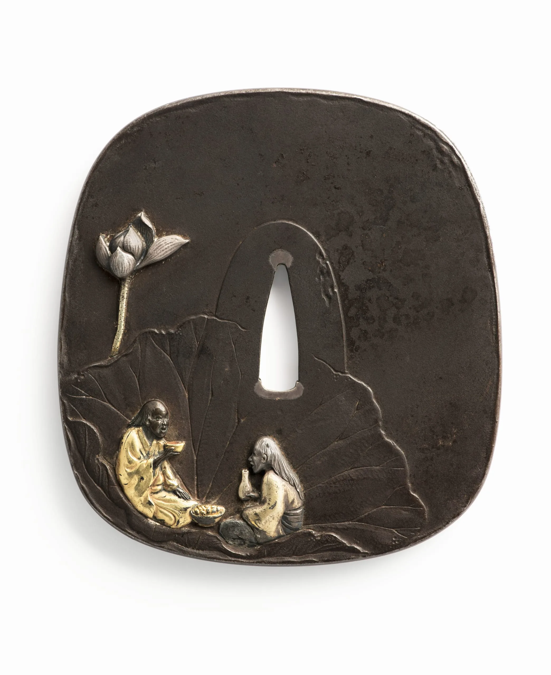 - Mixed metal with inlay of gold, silver, copper, and shibuichi