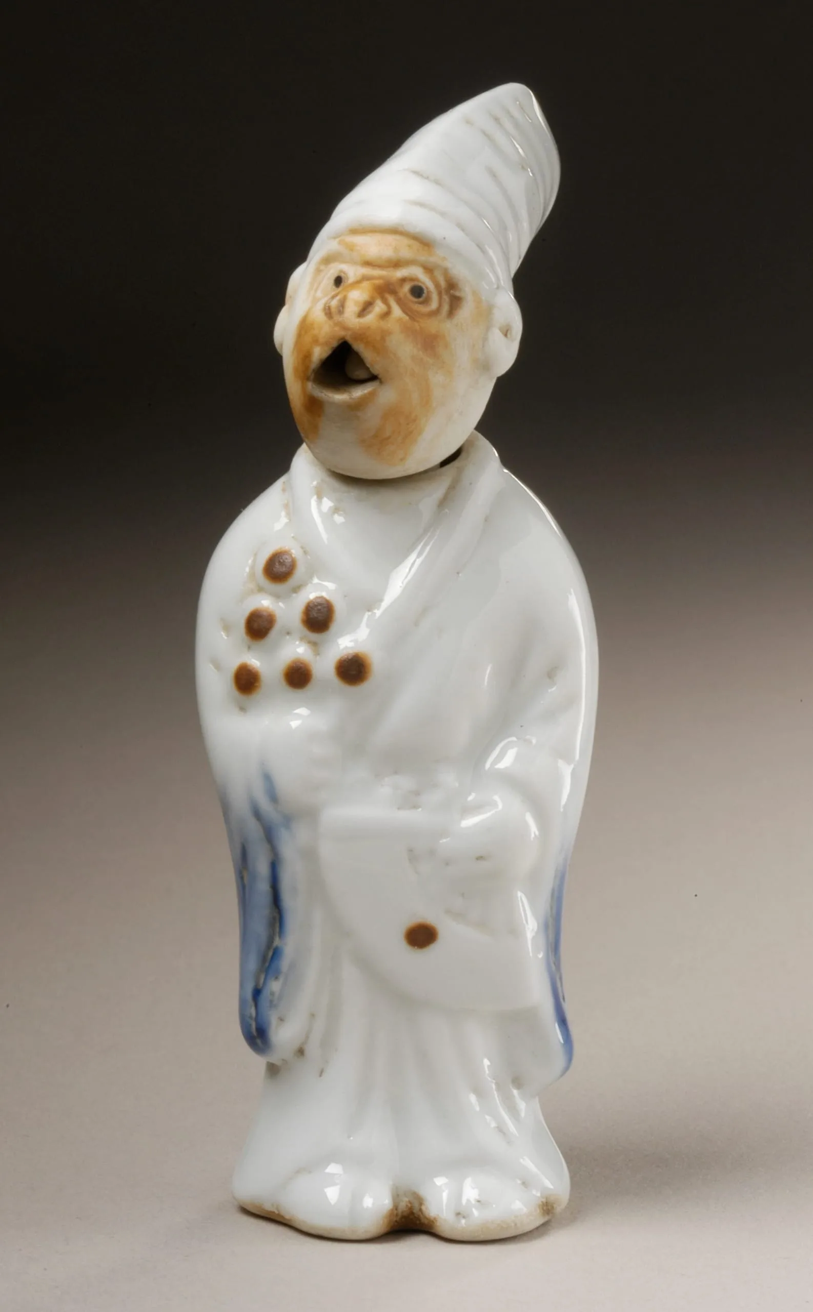 - Hirado Mikawachi ware; porcelain with stained biscuit reserve, blue underglaze, iron and clear glazes