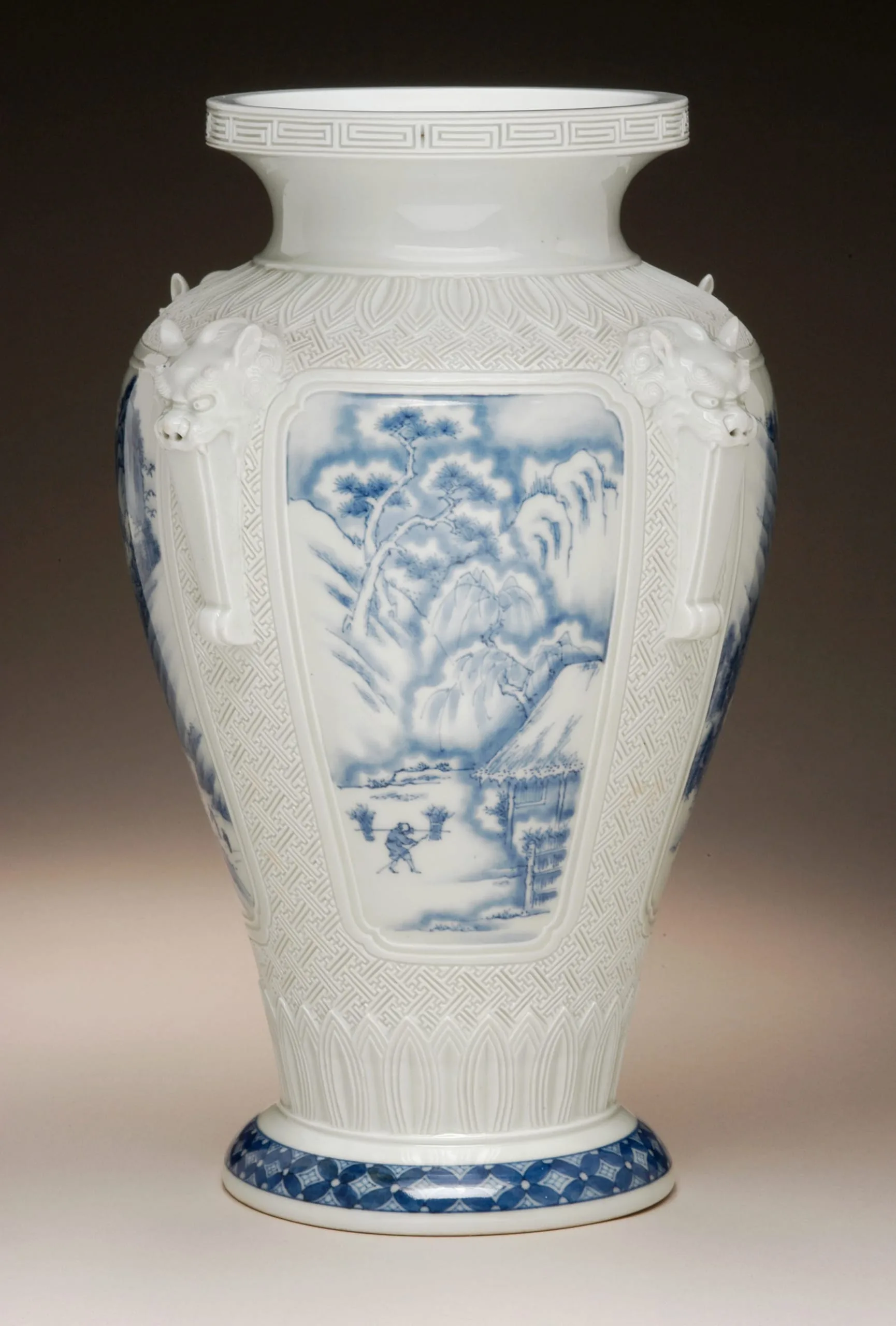 - Baluster Vase with Four Landscape Panels and Raised Monster Masks
