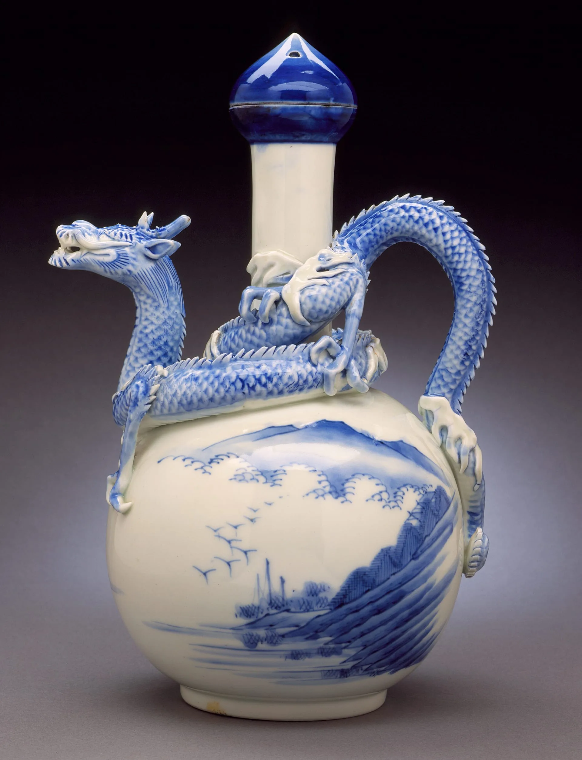- Ewer with Landscape and Raised Dragon Handle and Spout; Jewel-Formed Stopper