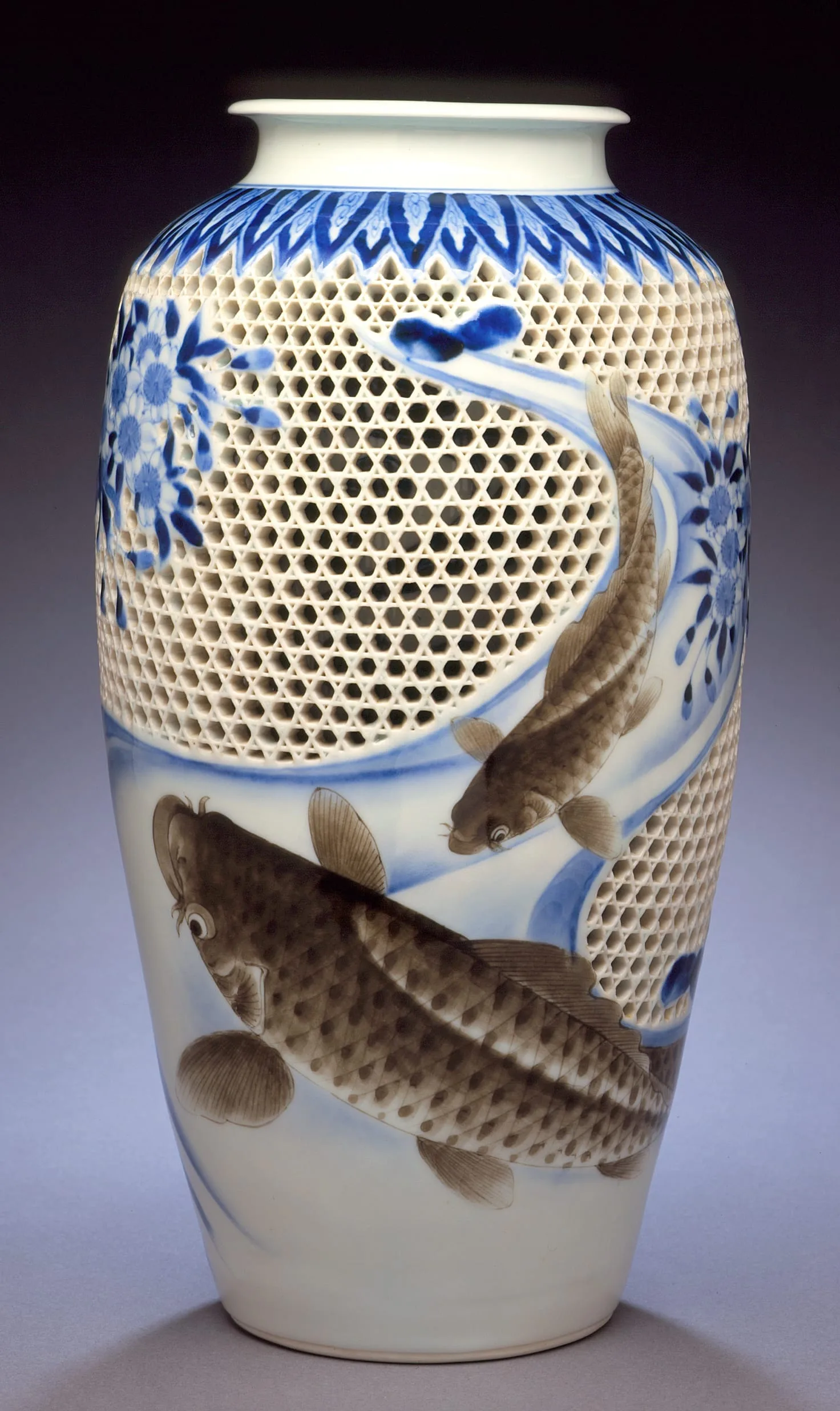- Vase with Open Work, Blossoming Cherry, Carp, and Stream