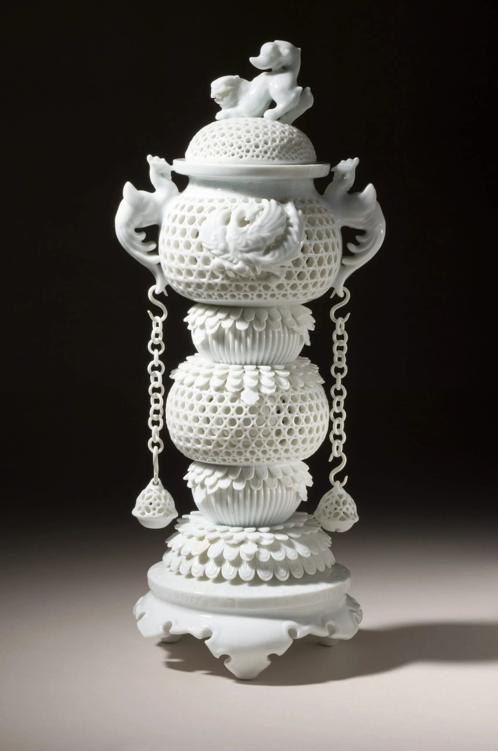 - Toilet Censer with Raised Chrysanthemums and Phoenixes, and Pendant Chains and Baubles; Chinese Lion Knop