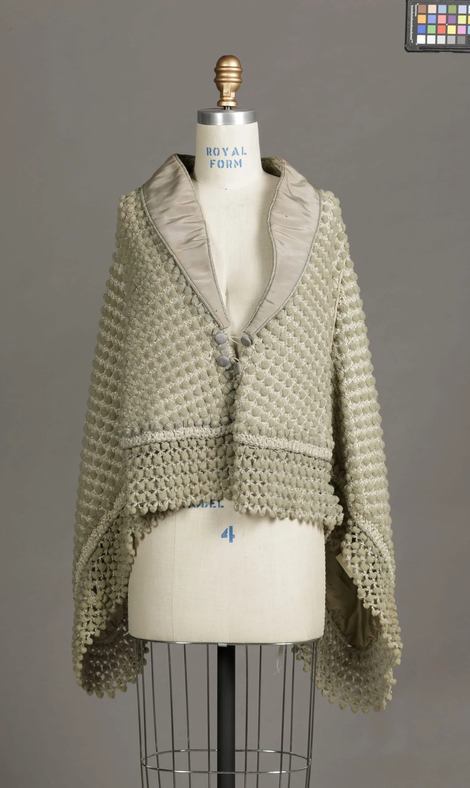- Silk plain weave (faille) and silk plain weave (taffeta) with wool and silk embroidery and silk-thread covered buttons