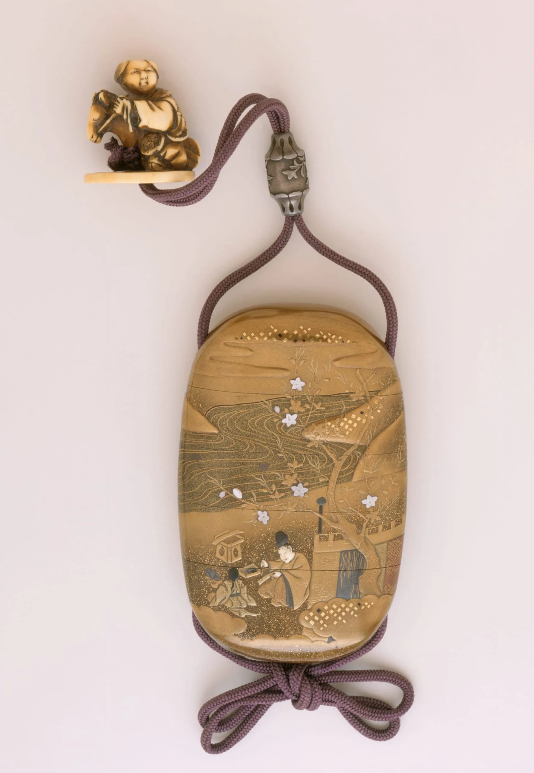 - [inrō] Gold takamakie and kirigane on kinji and nashiji lacquer ground with mother-of-pearl and ivory inlays; [ojime] mixed metals (silver with gold inlays); [netsuke] ivory with staining