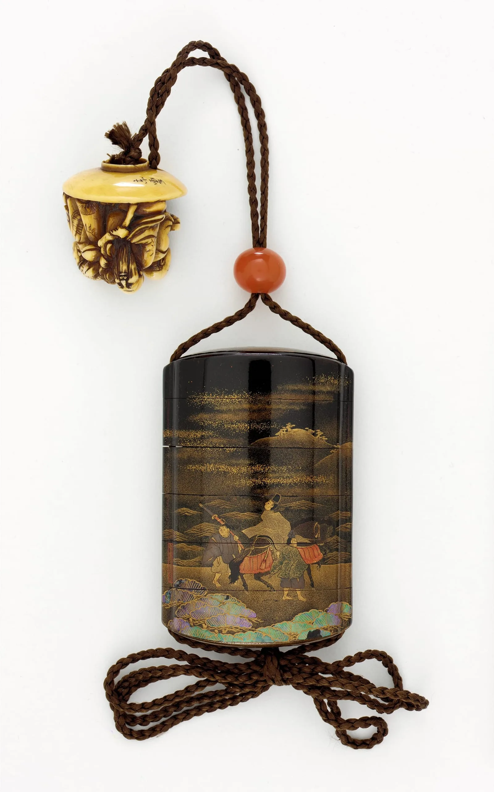 - [inrō] Gold and iroye togidashi on black lacquer ground, with mother-of-pearl inlays; [ojime] shakudō and sentoku; [netsuke] ivory with staining