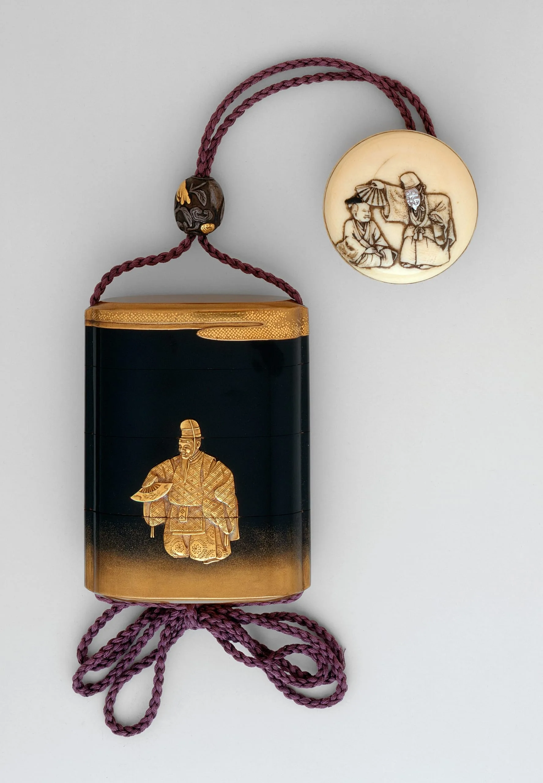 - [inrō] Roiro ground and kinji lacquer with metal (gold) inlay; [ojime] mixed metals (silver and gold); [netsuke] ivory with staining