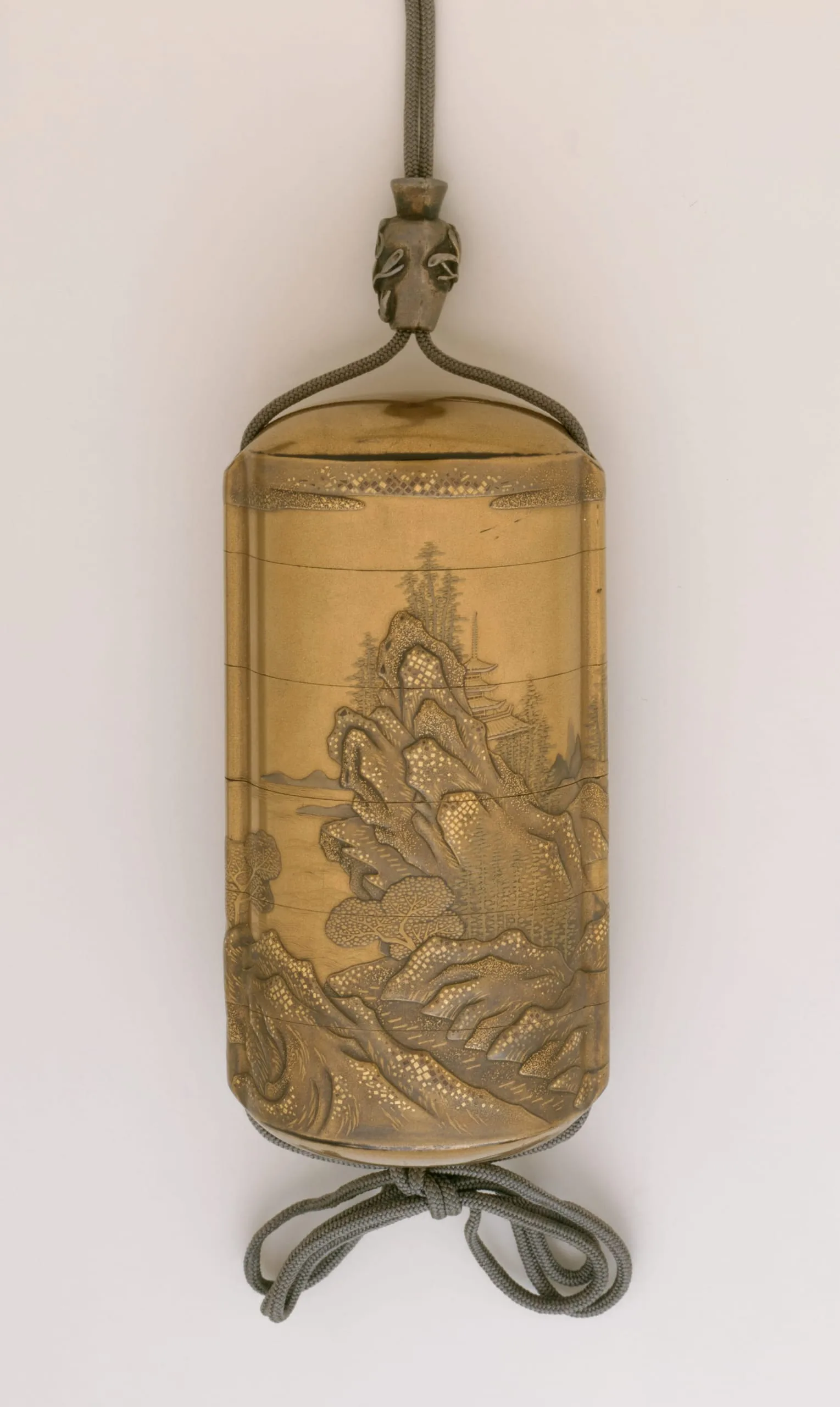 - [inrō] gold takamakie, kirigane, and e-nashiji lacquer on gold fundame ground; [ojime] metal; [netsuke] ivory