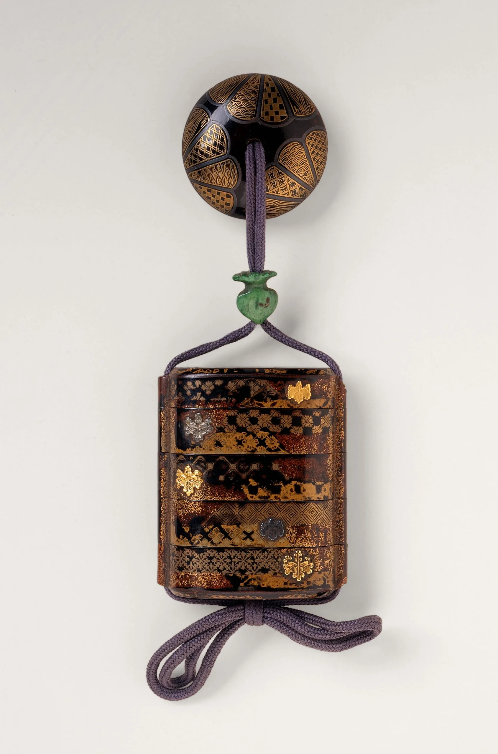 - a) [inrō] black and gold hiramakie, and red nashiji lacquer with metal inlays; b) [ojime] stained bone(?)