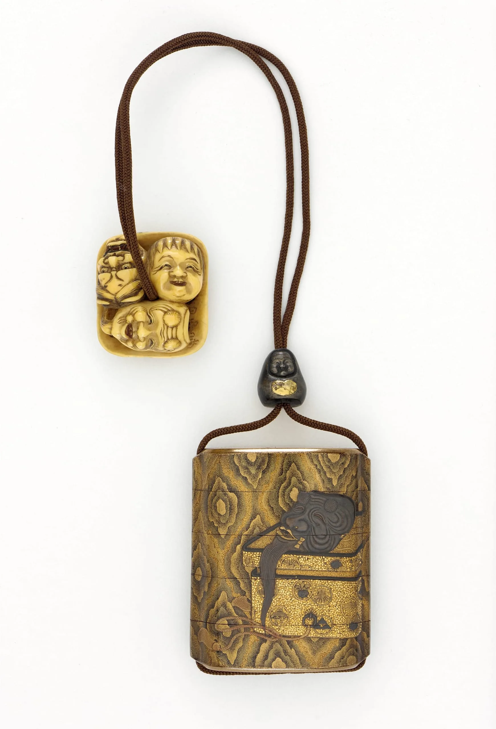 - [inrō] Gold, black and gray hiramakie on togidashi ground of black and gold mokume lacquer; [ojime] mixed metals (shibuichi and silver) and gilt; [netsuke] ivory