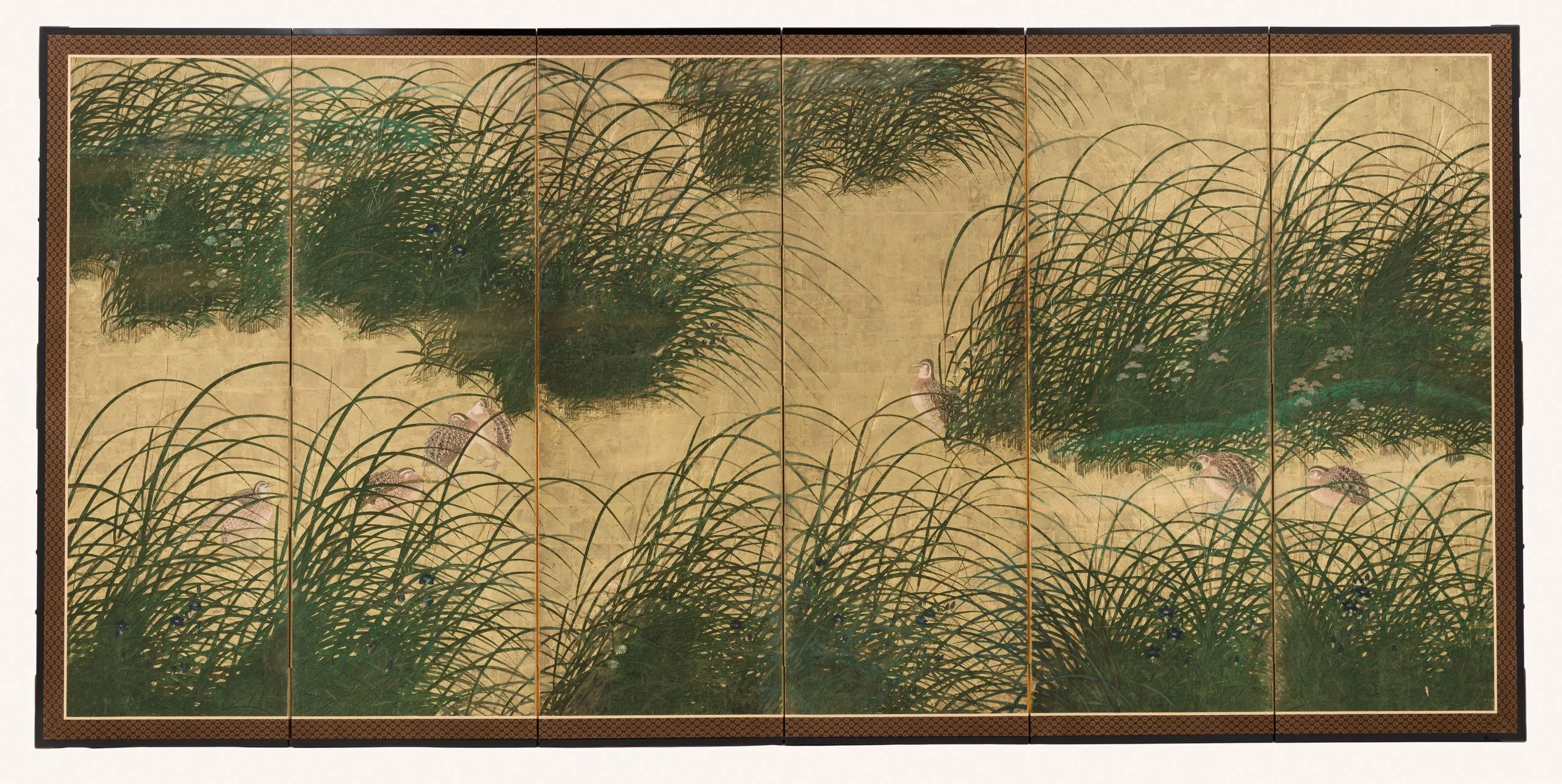 - Six-panel screen; ink, color, and gold leaf on paper