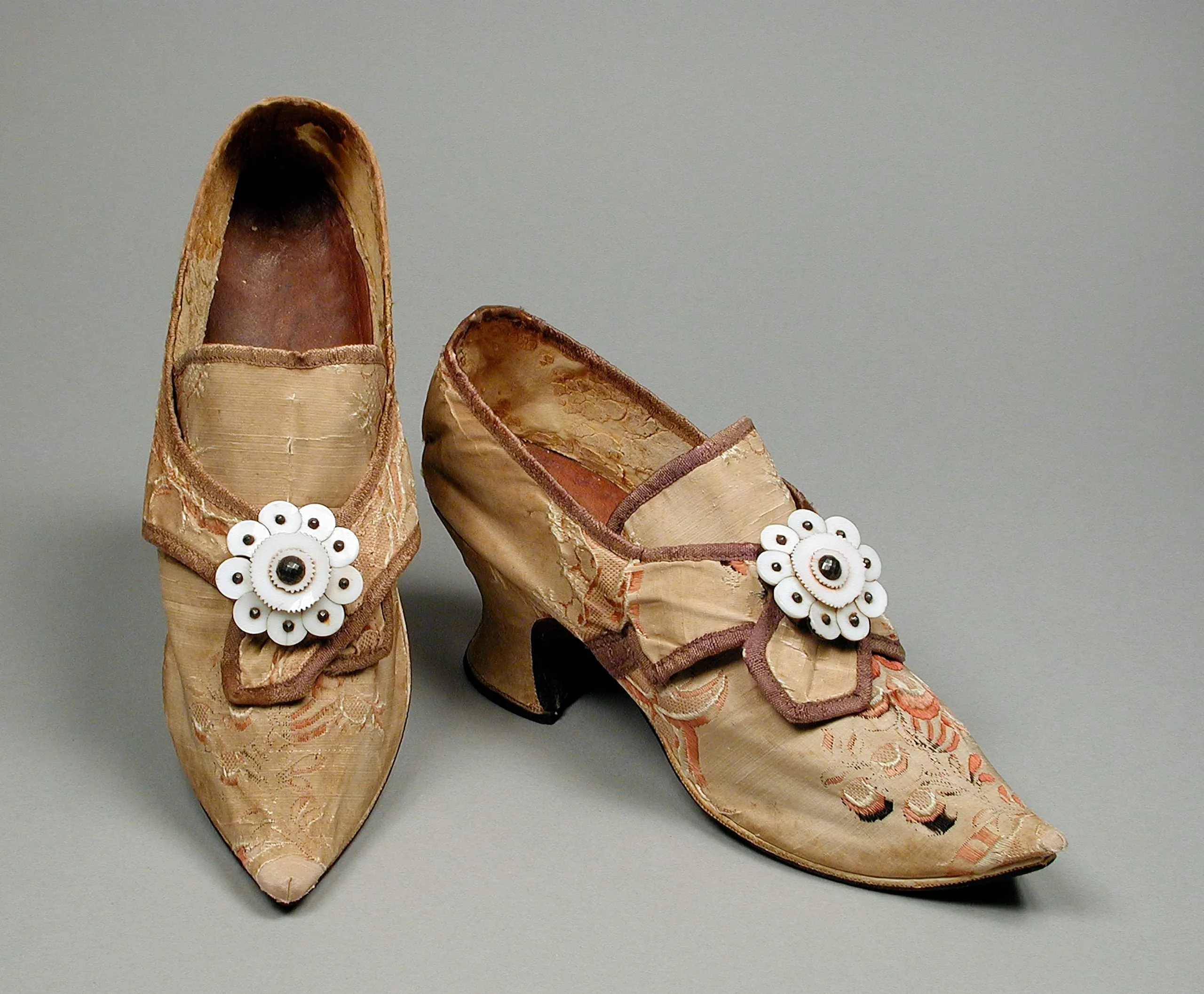 - a,b) Shoes: Brocaded silk, leather, linen, kid leather; c,d) Buckles: conch shell, brass, metal