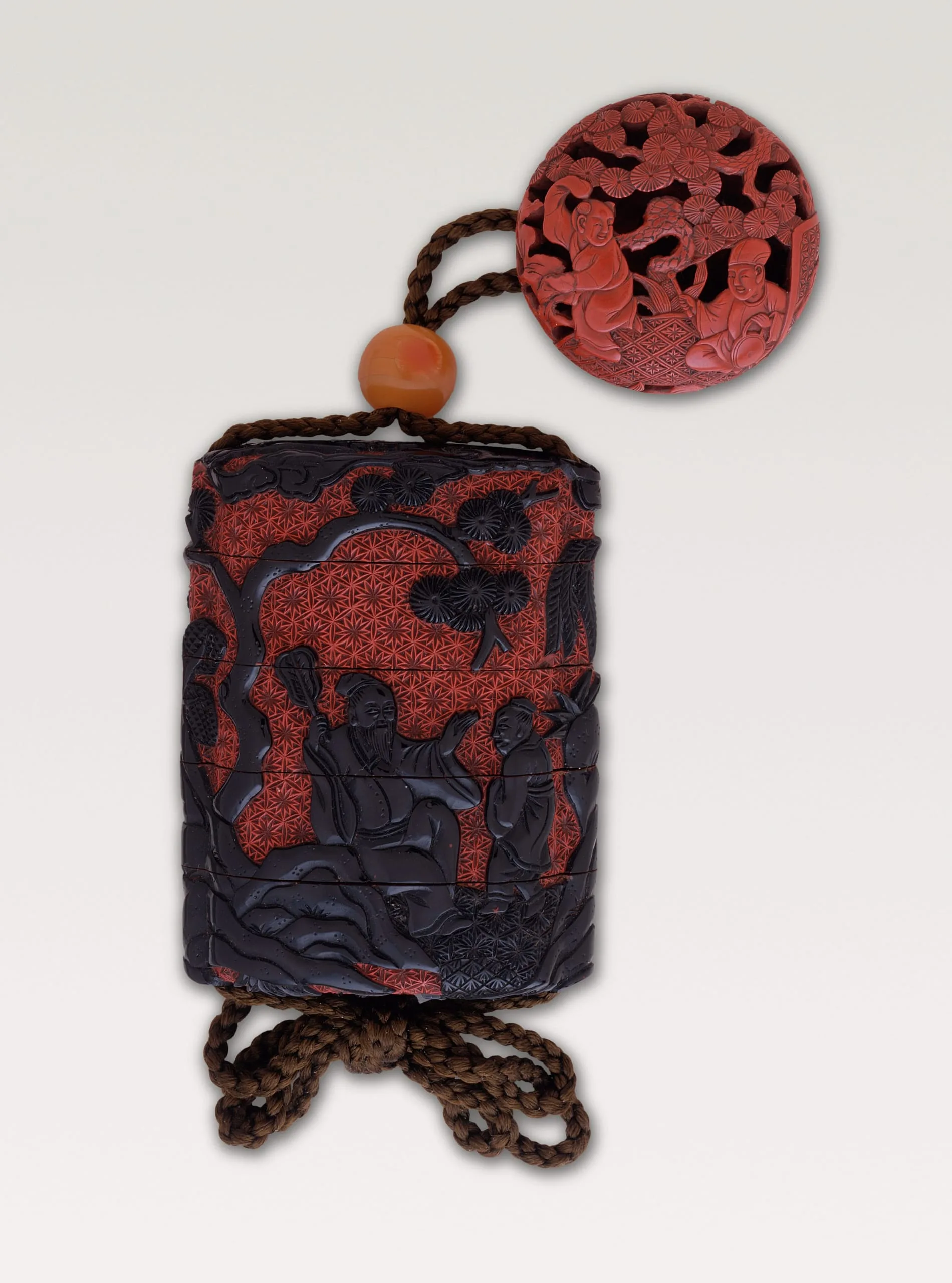 - [inrō] Carved black lacquer (tsuikoku) over carved red lacquer (tsuishu) ground; [ojime] bead of agate?; [netsuke] carved red lacquer (tsuishu)