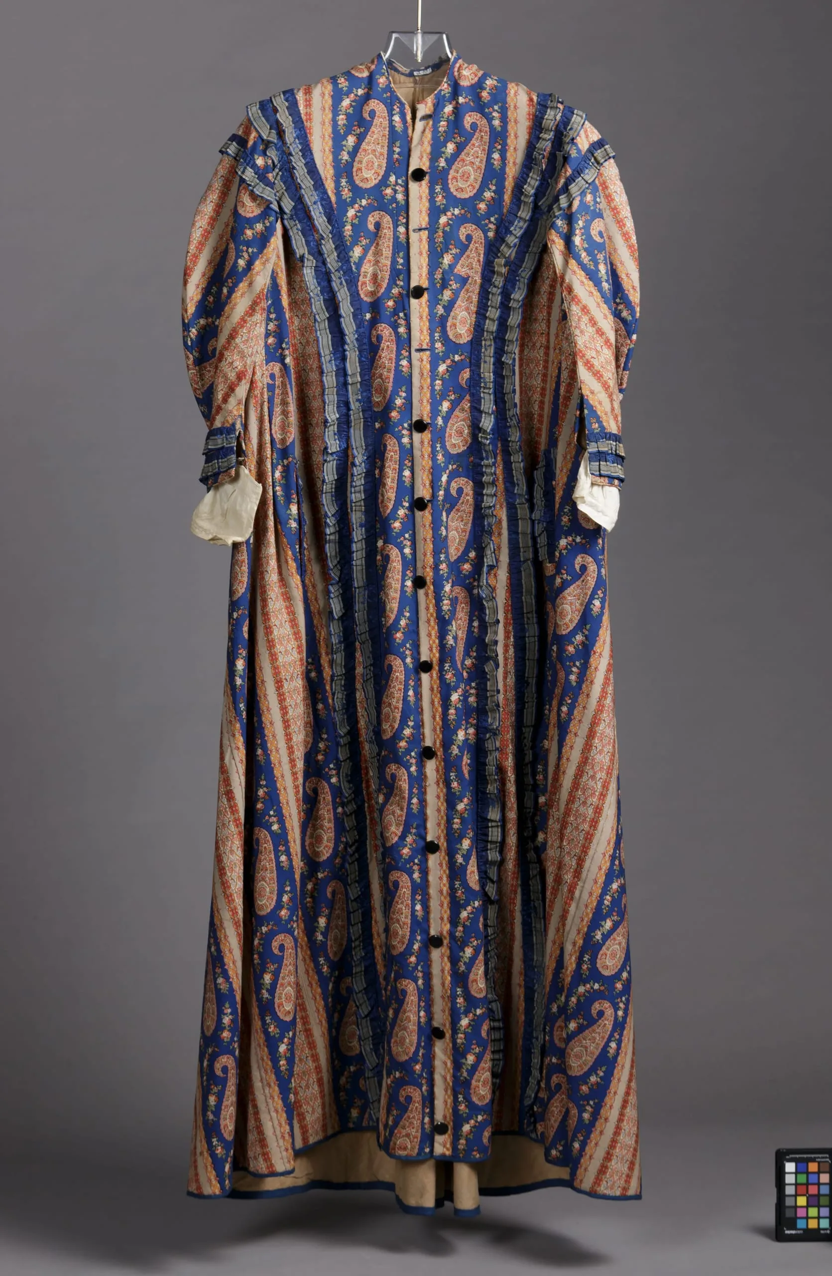 - Wool plain weave, roller-printed, with silk ribbon and cotton plain weave trim
