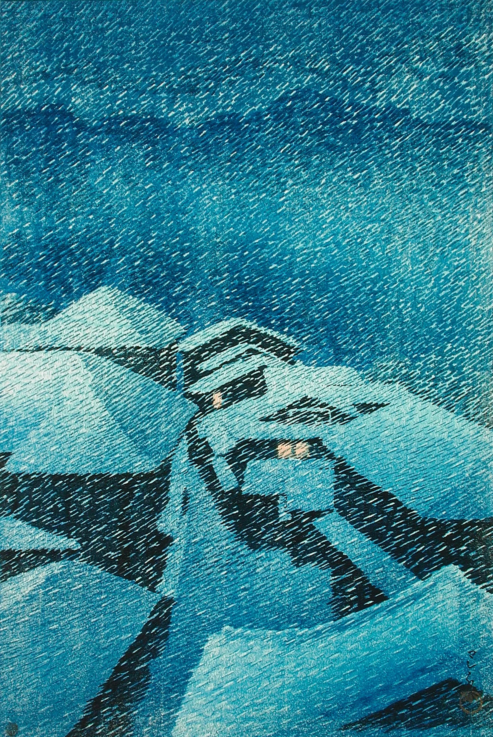 Vertical woodblock print of a snow-covered village street at night, rendered in deep navy and ice-blue hatch marks, with two amber-lit windows glowing among dark rooftops