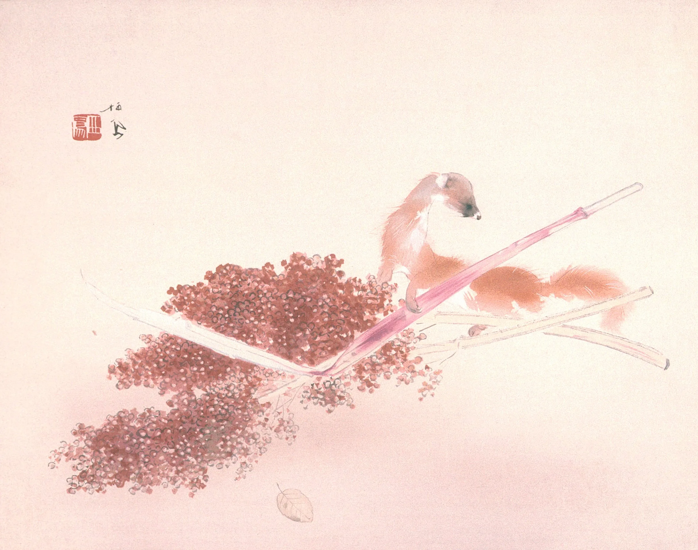 East Asian ink and color painting of a small rust-and-white animal perched on a tray of reddish berries, with translucent stems and a red seal in the upper left