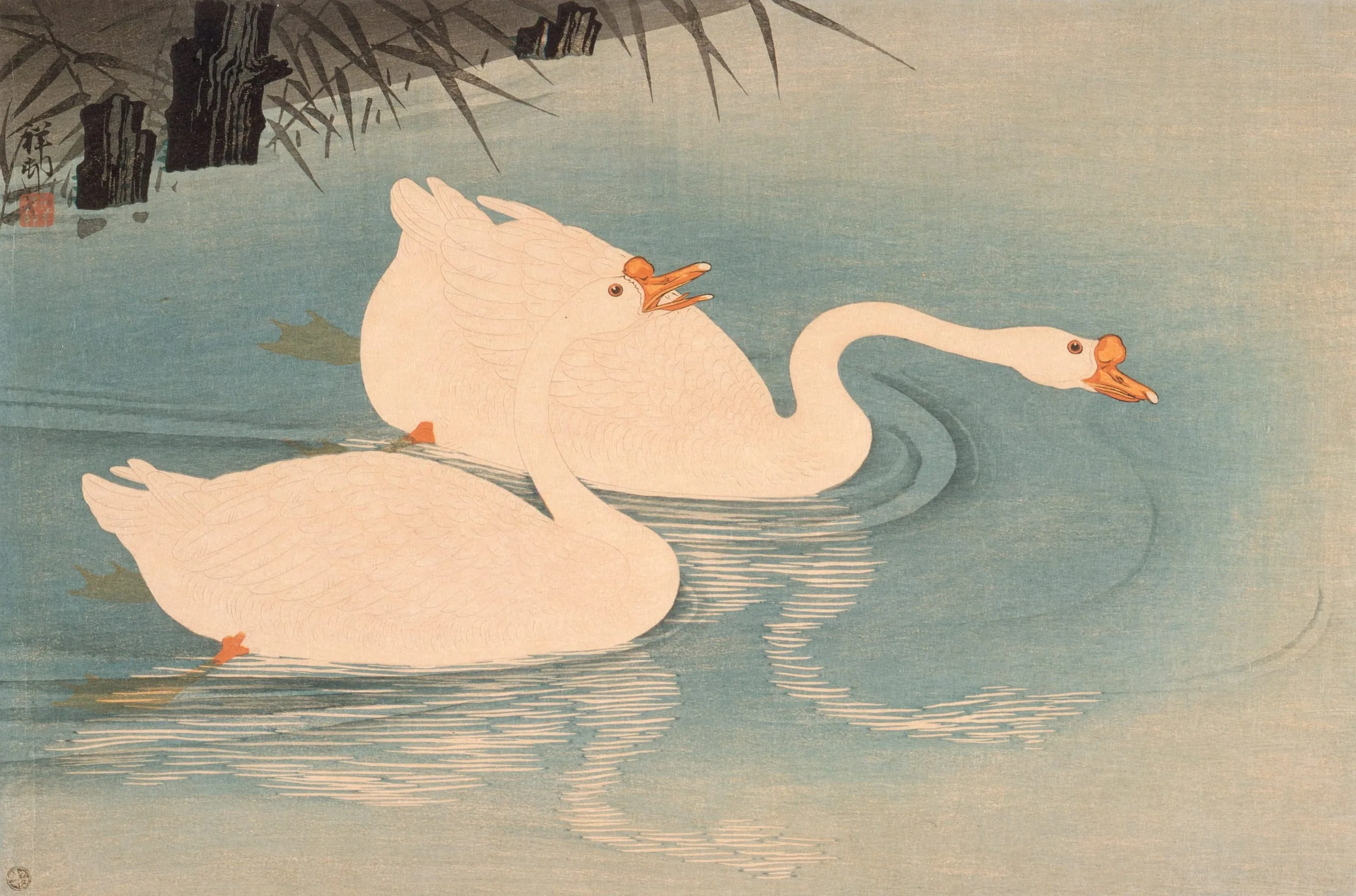 White Chinese Geese amid Reeds