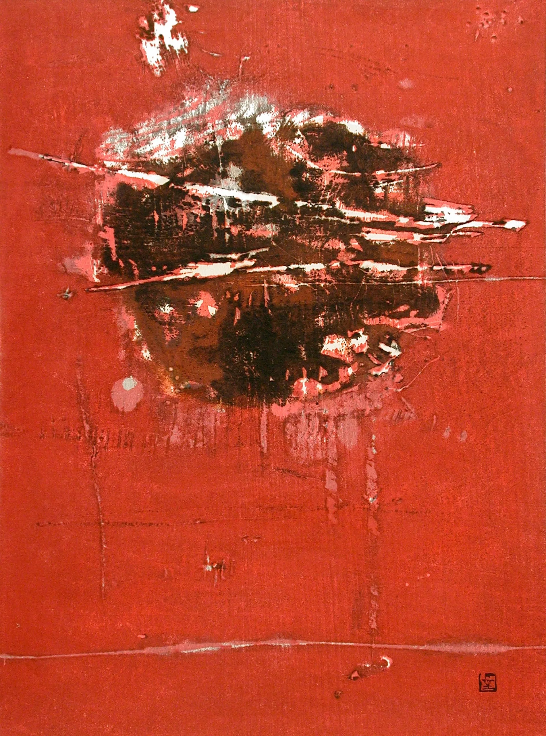 - Color woodblock print from burnt plywood, turpentine-diluted ink and color on torinoko paper
