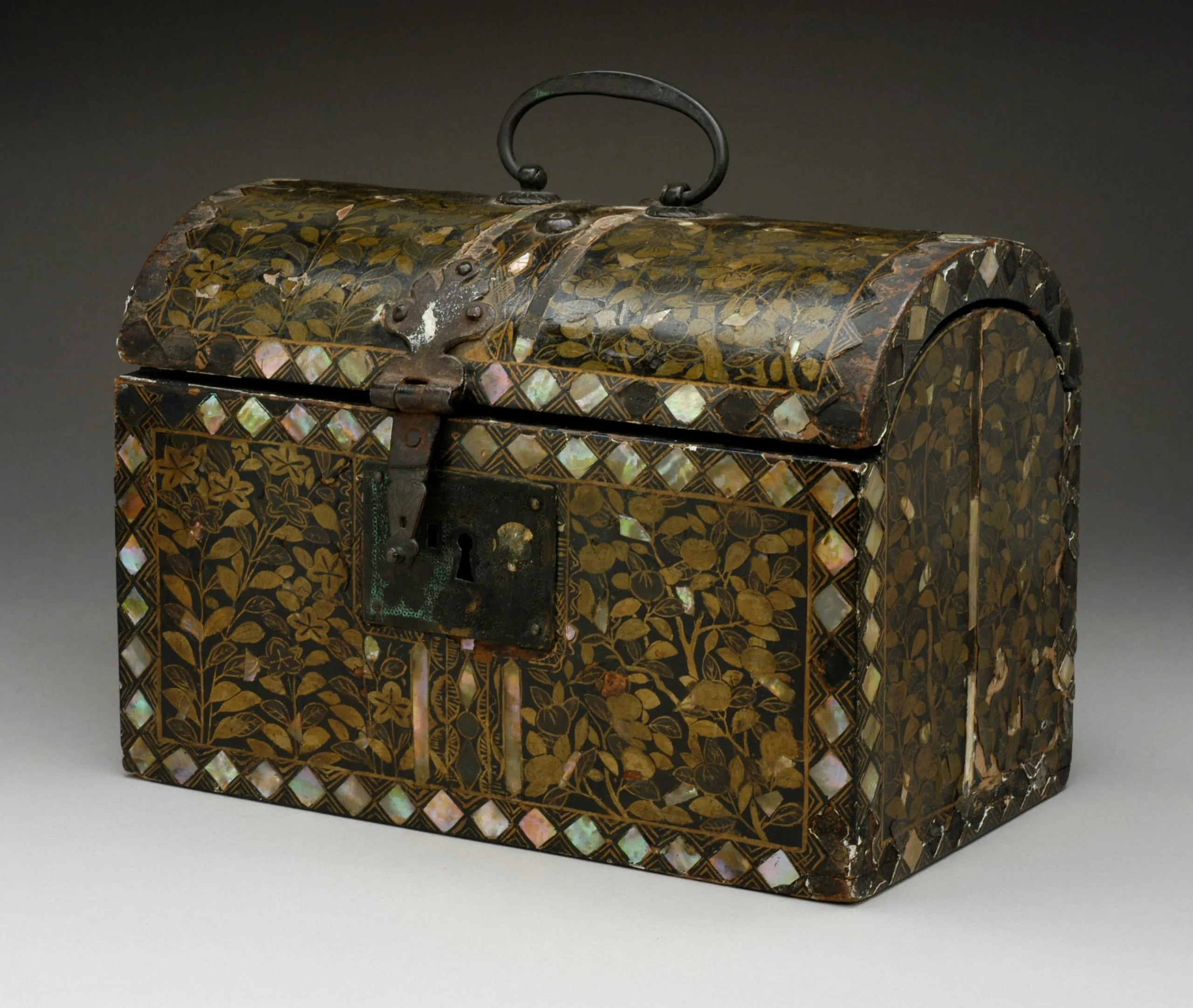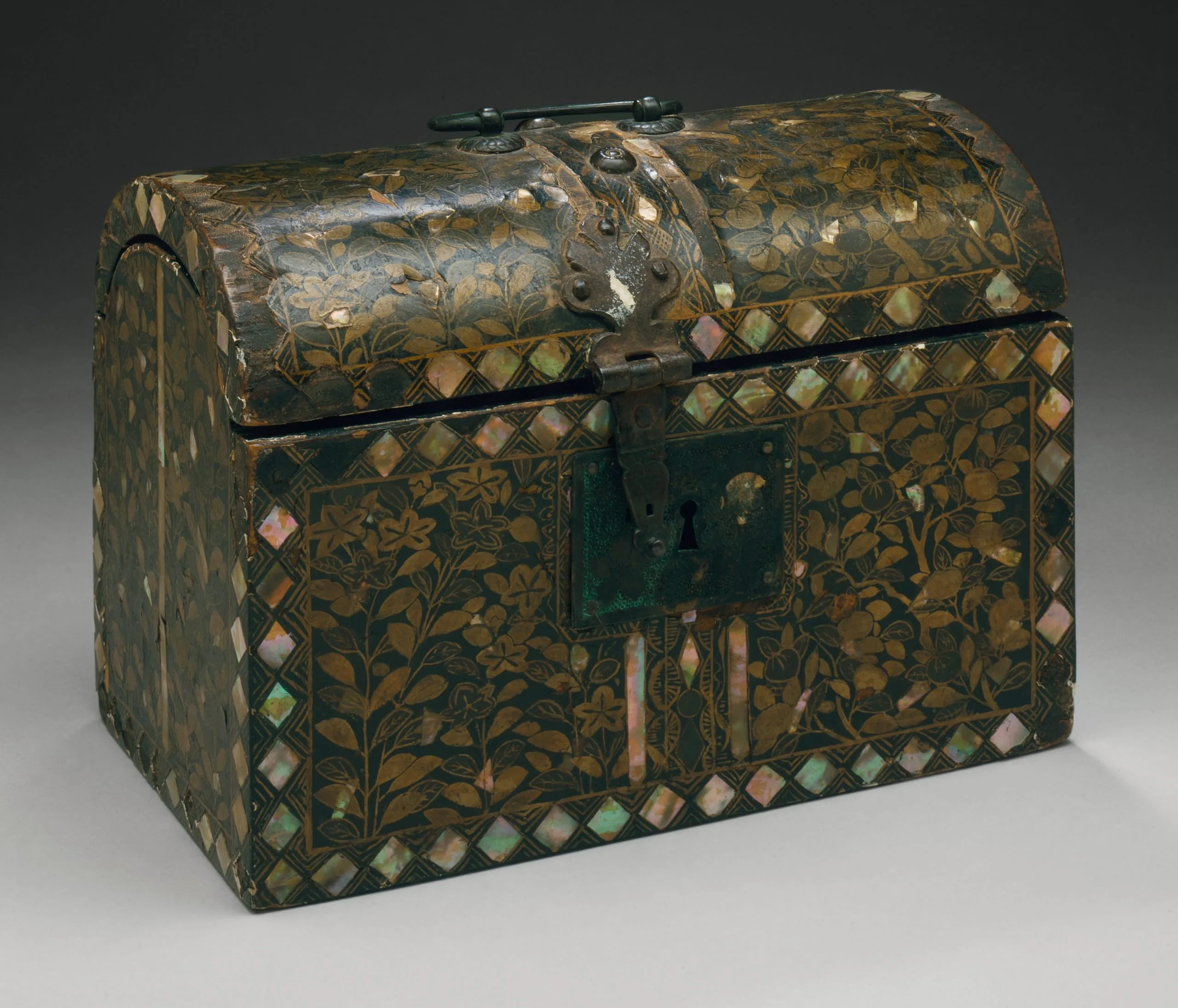 - Black lacquer with maki-e (sprinkled powder design) and mother-of-pearl inlay