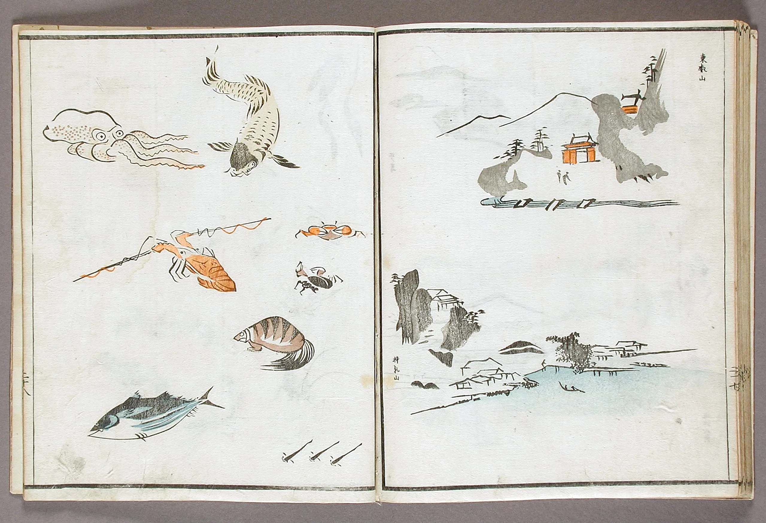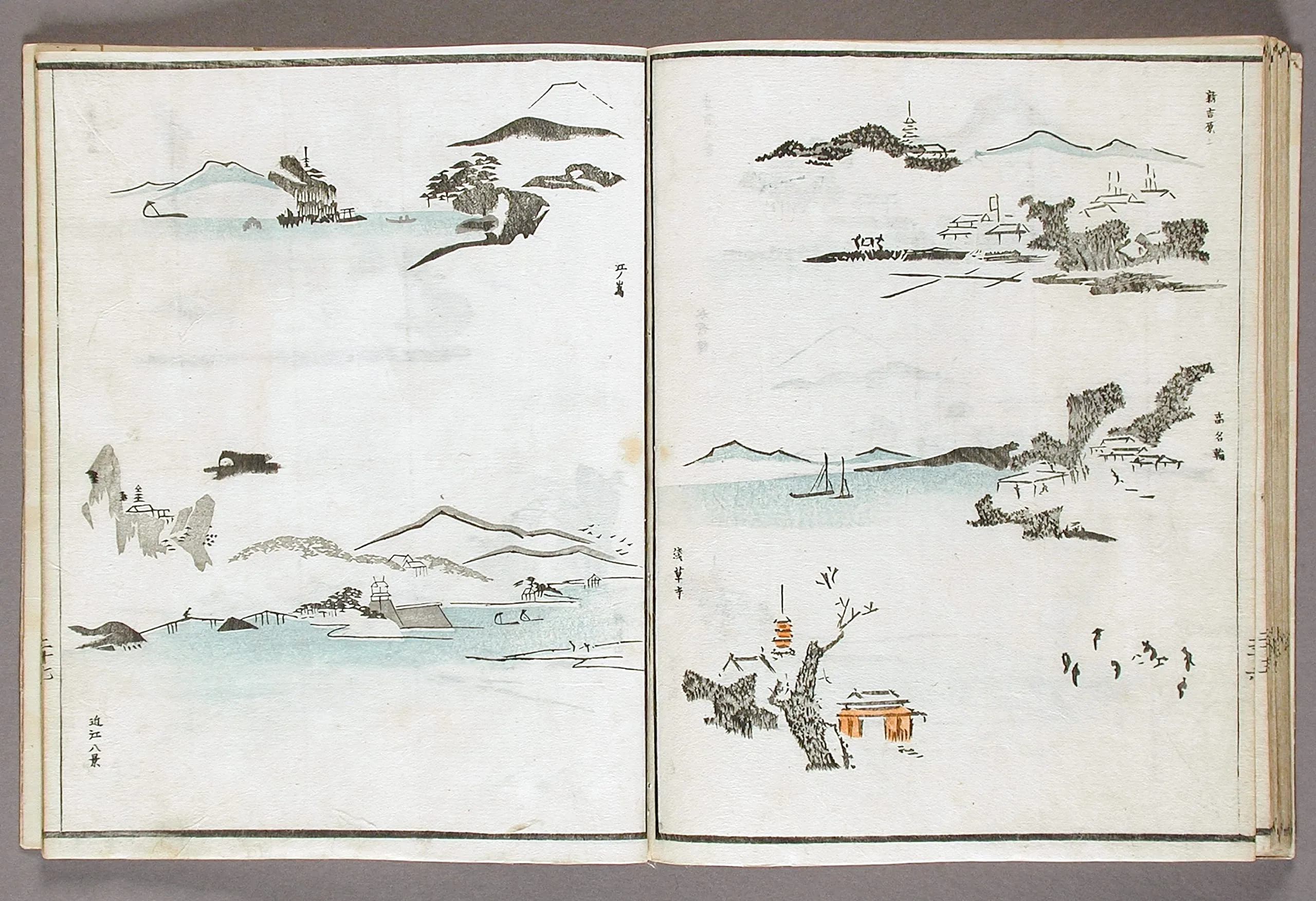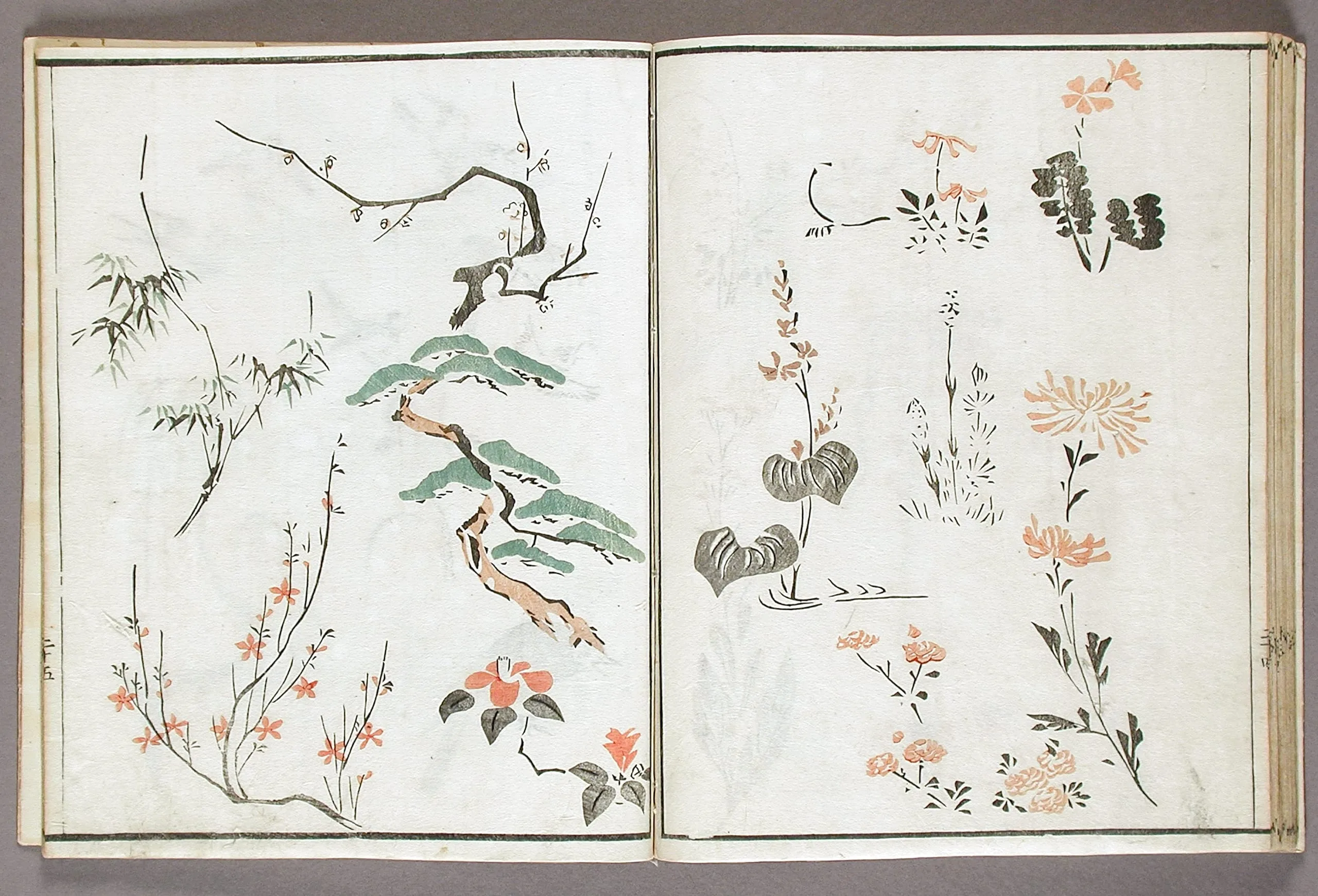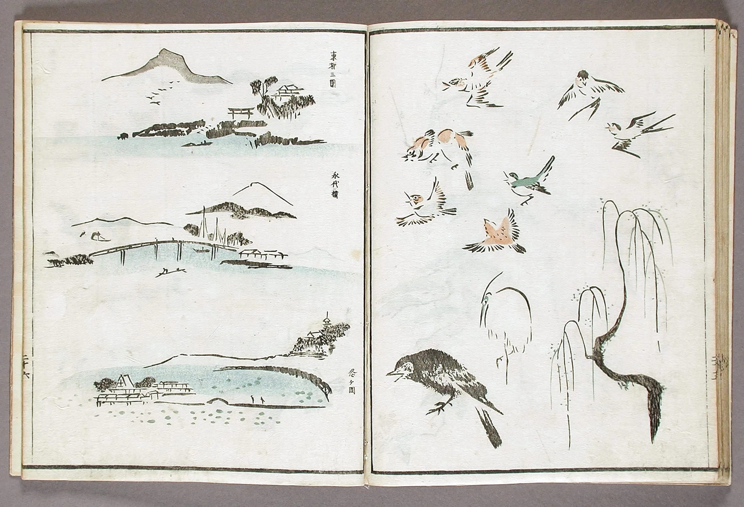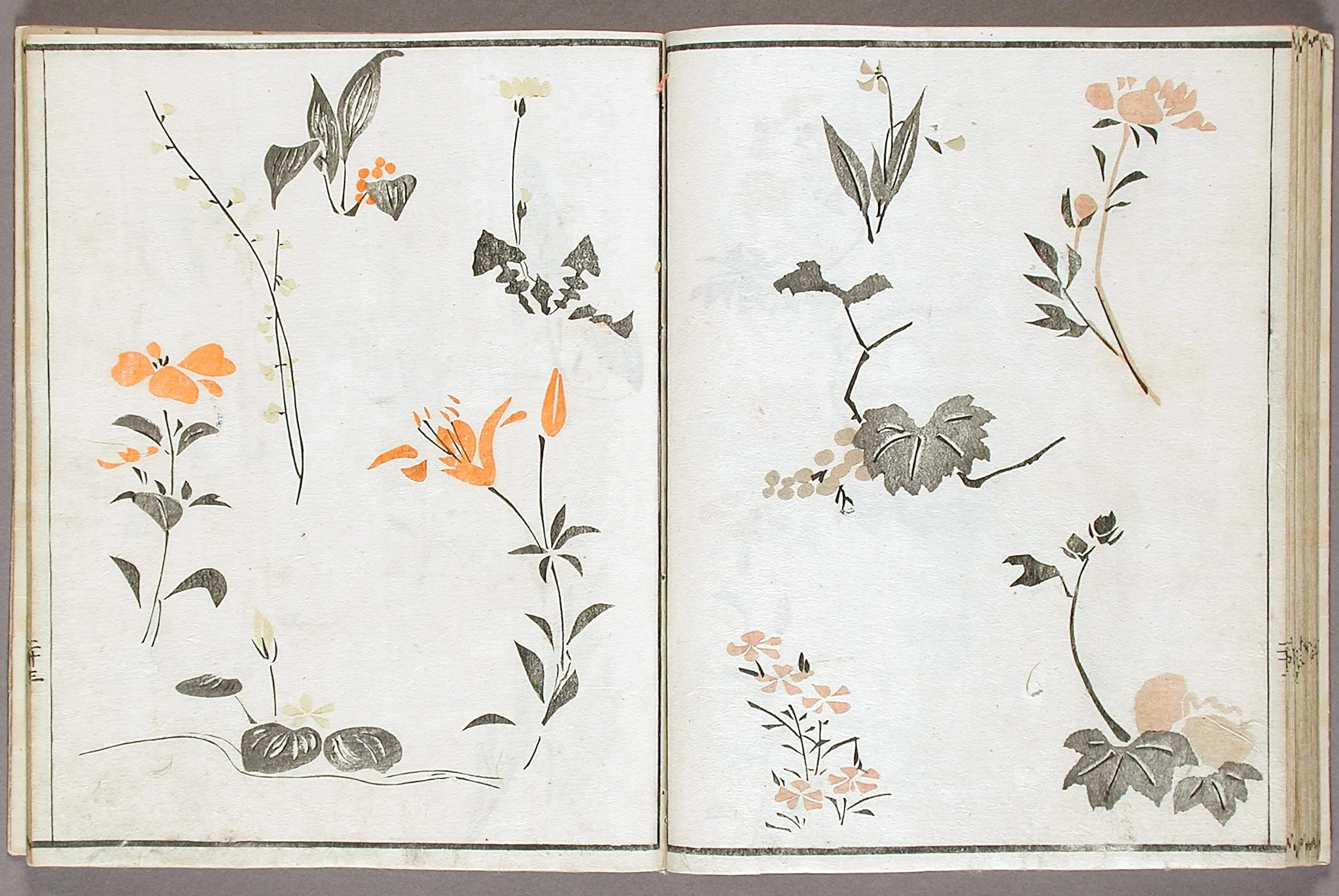- Woodblock print book; ink and colors on paper, silk cover
