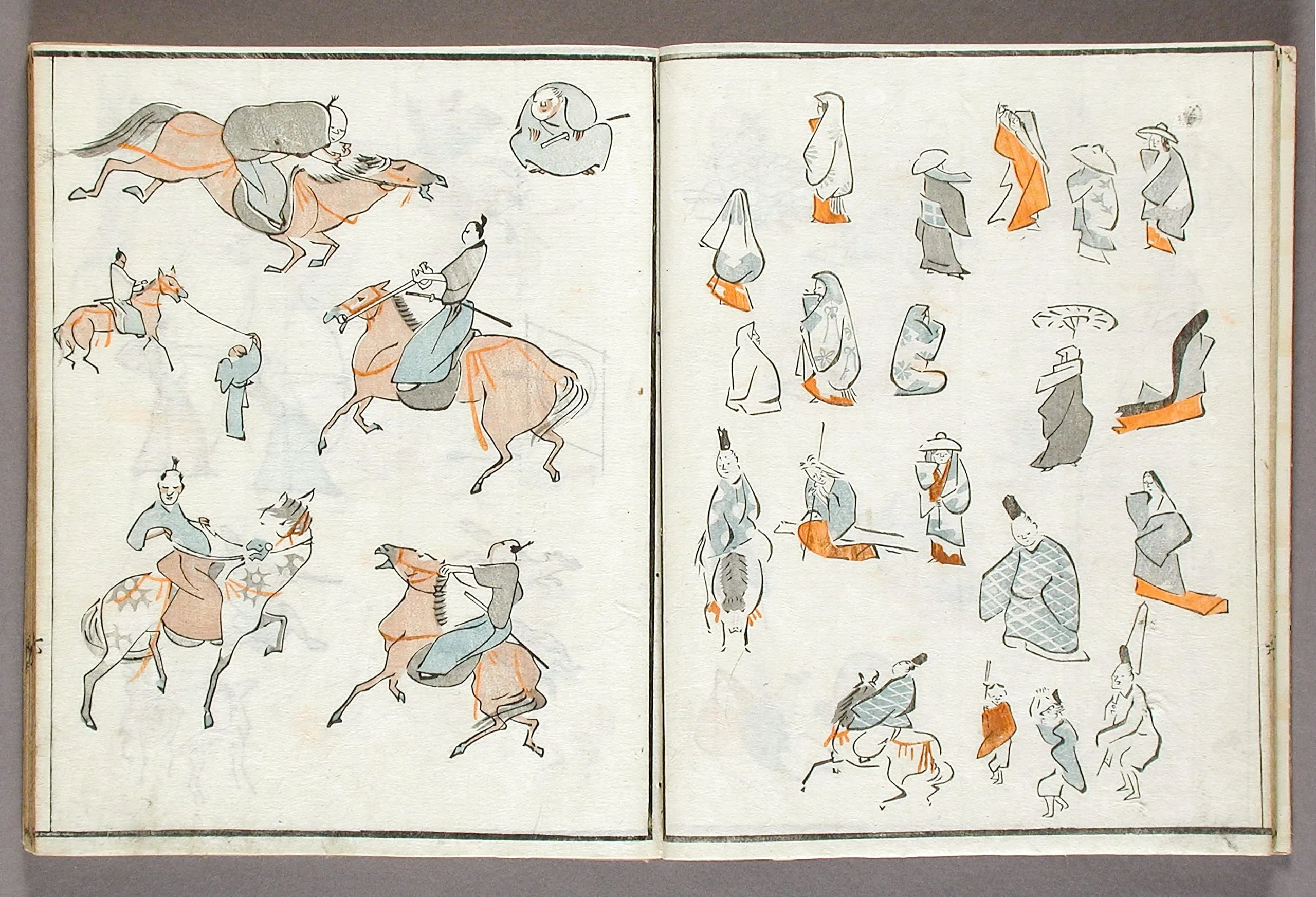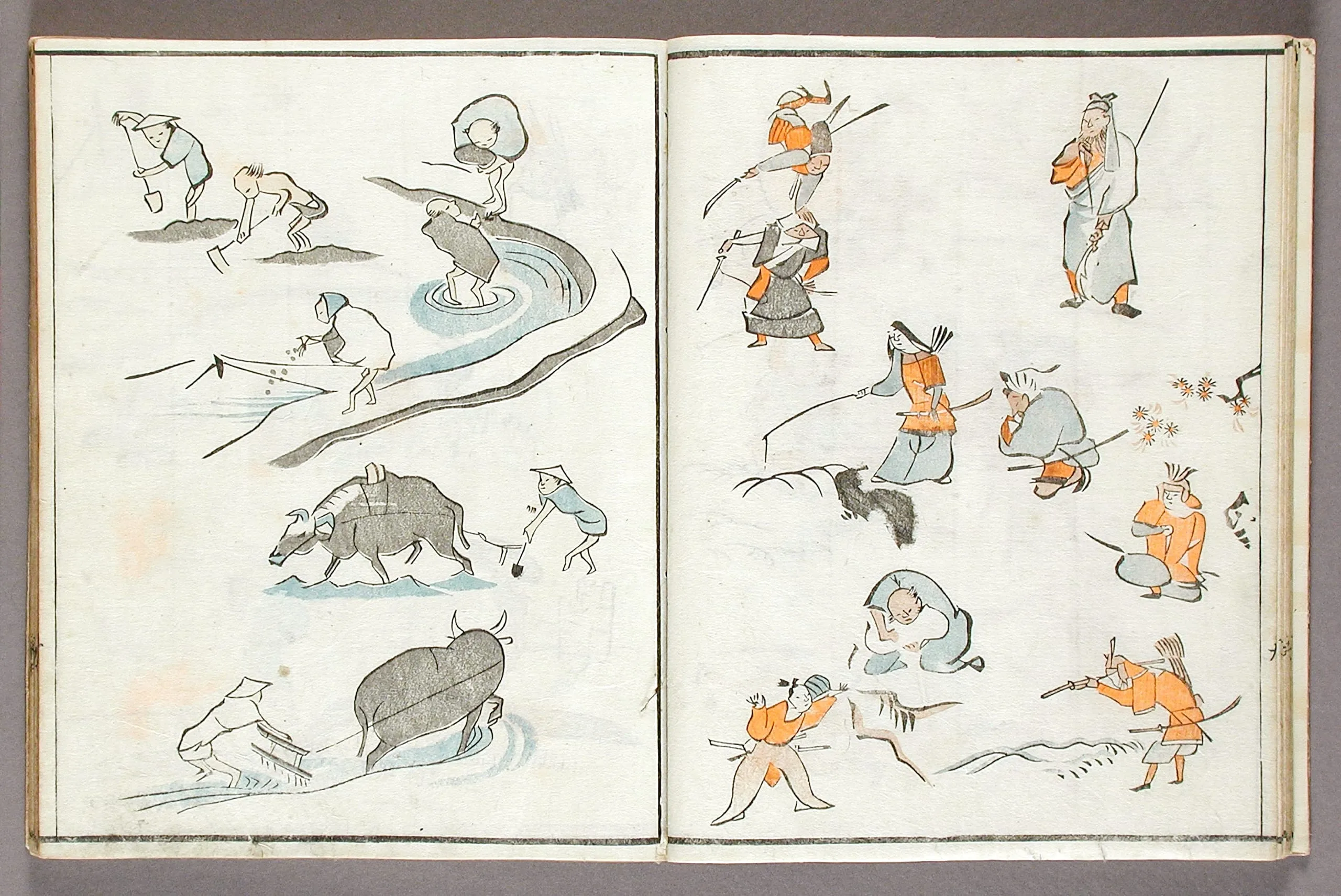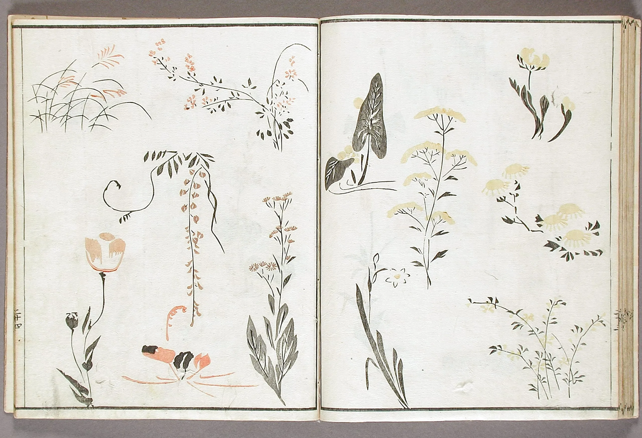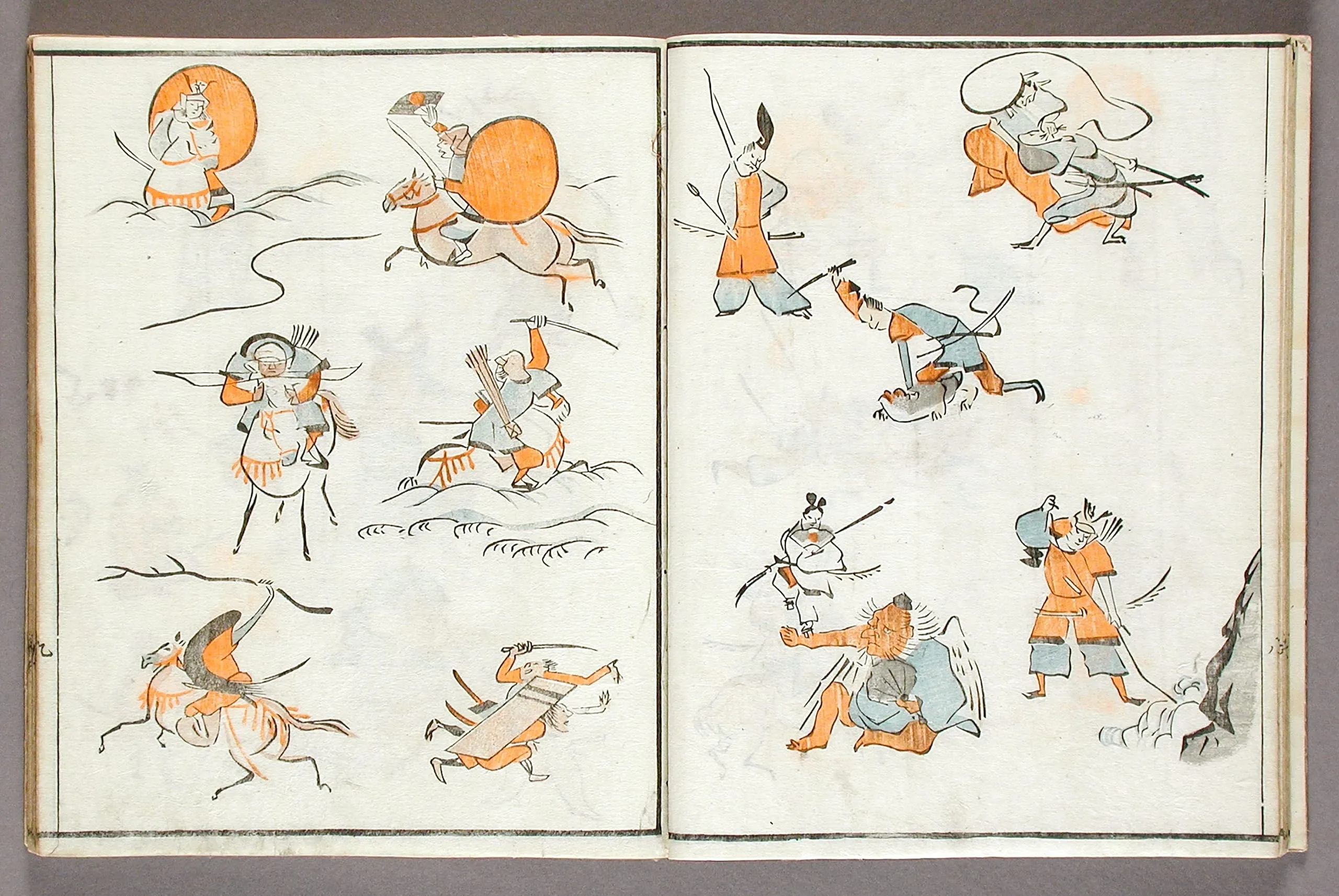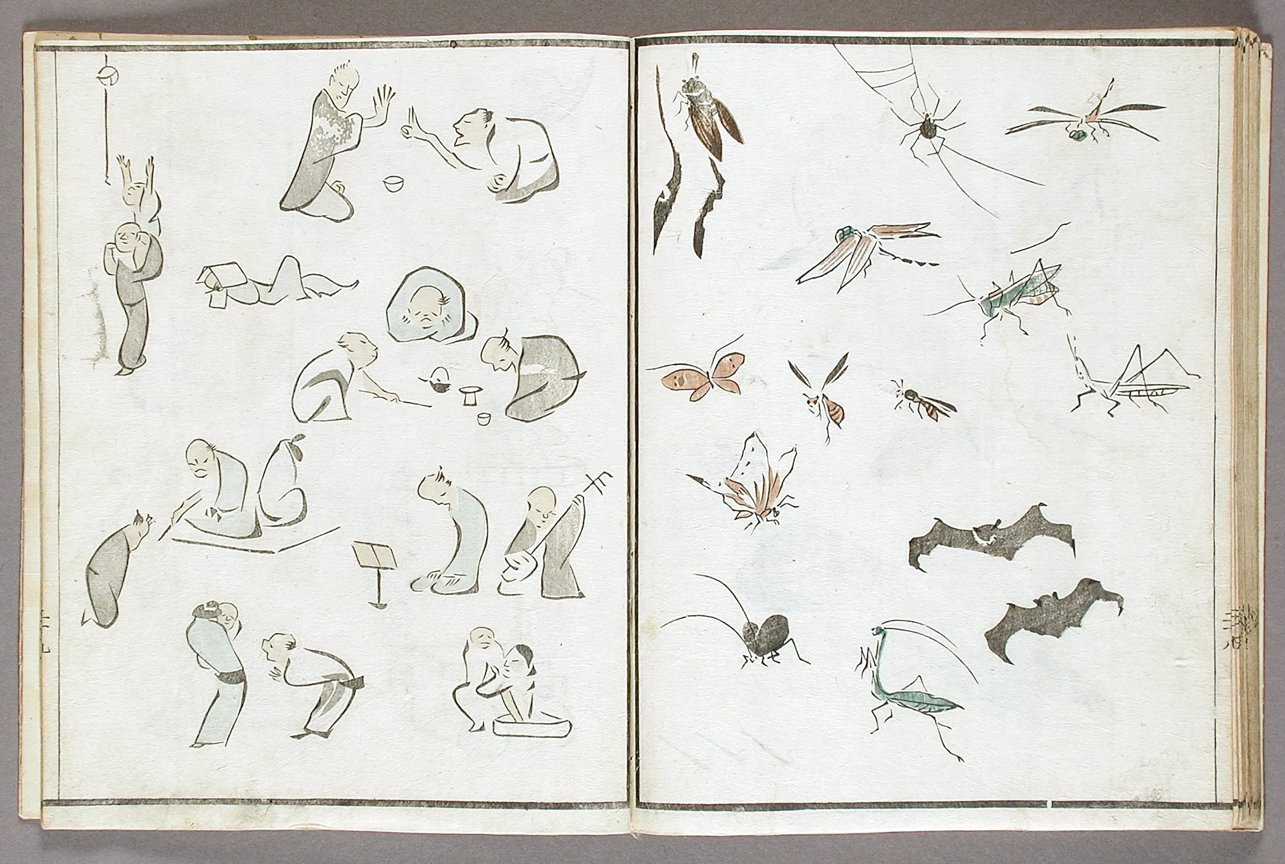 - Woodblock print book; ink and colors on paper, silk cover