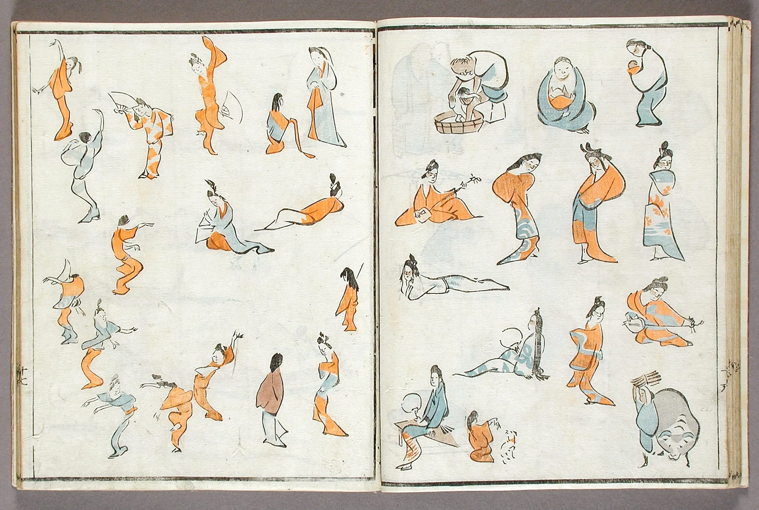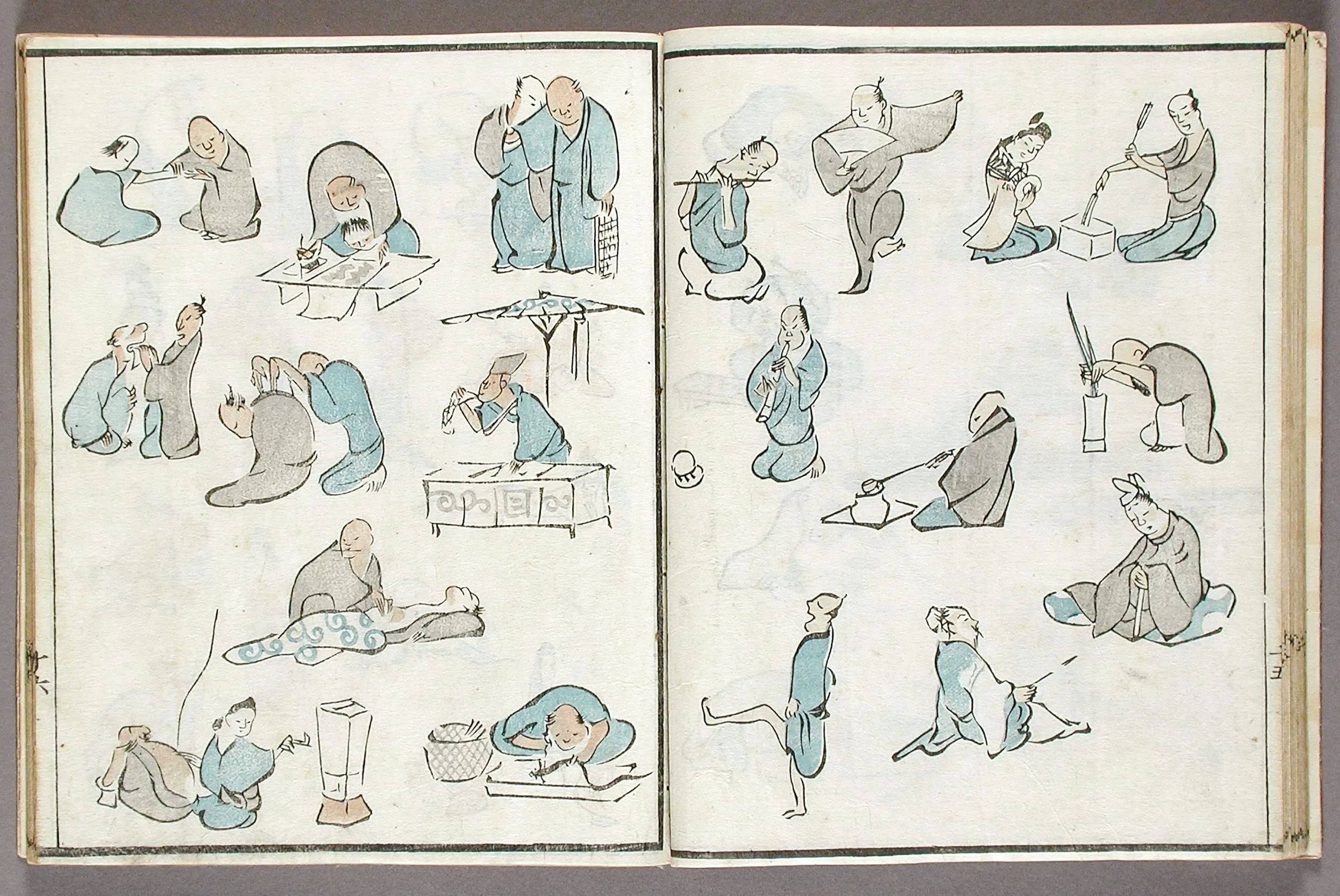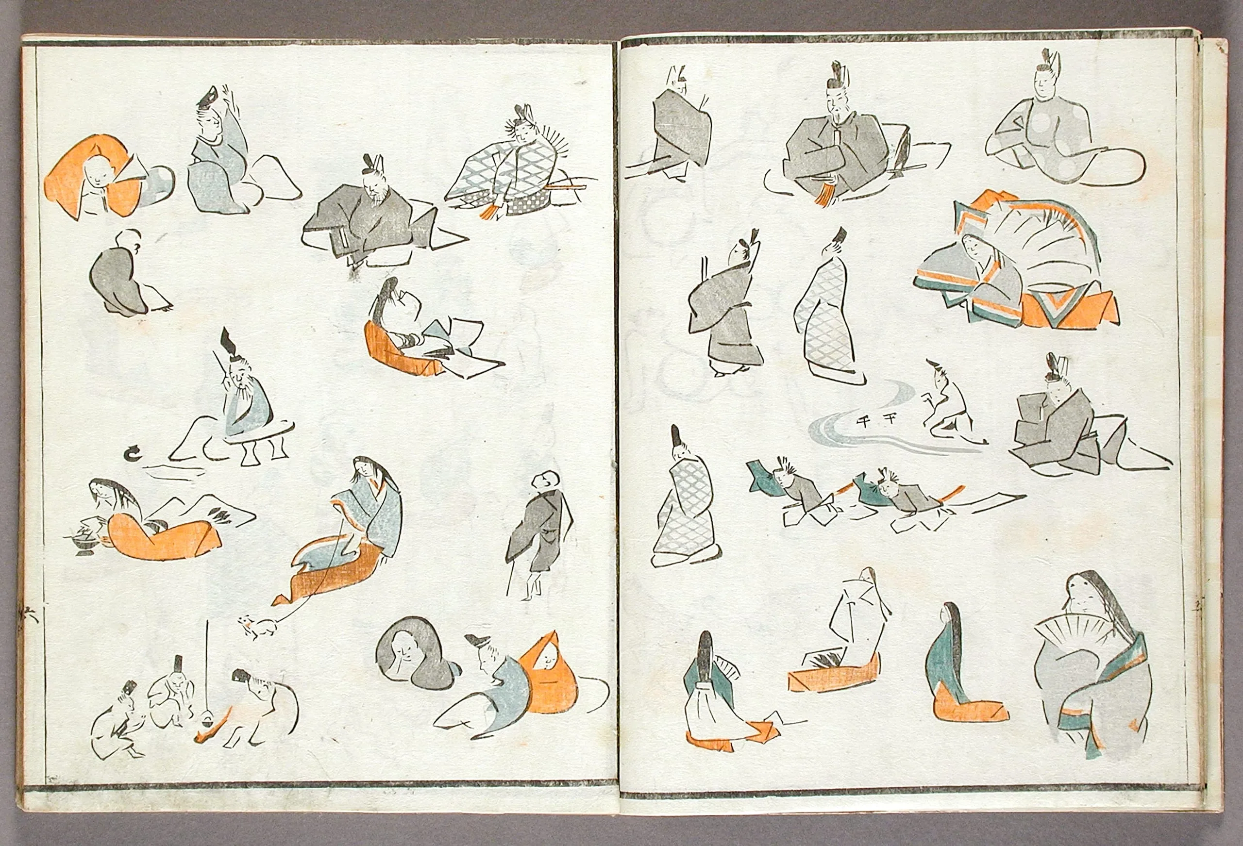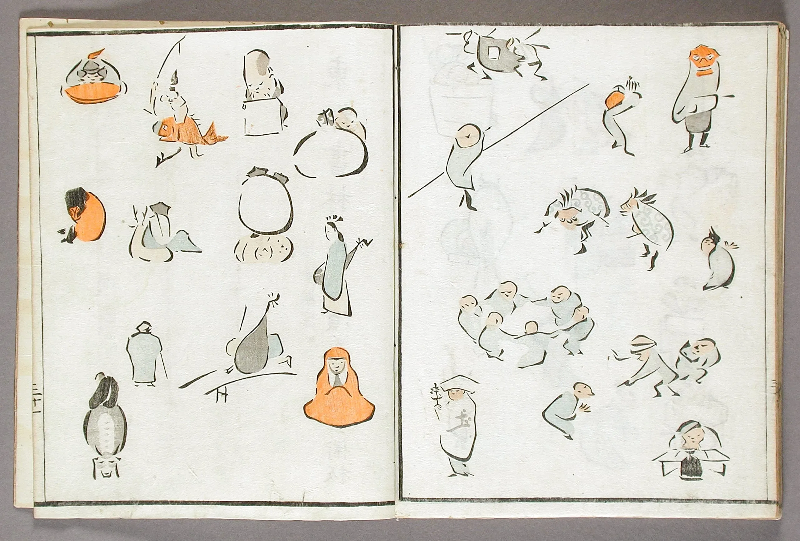 - Woodblock print book; ink and colors on paper, silk cover