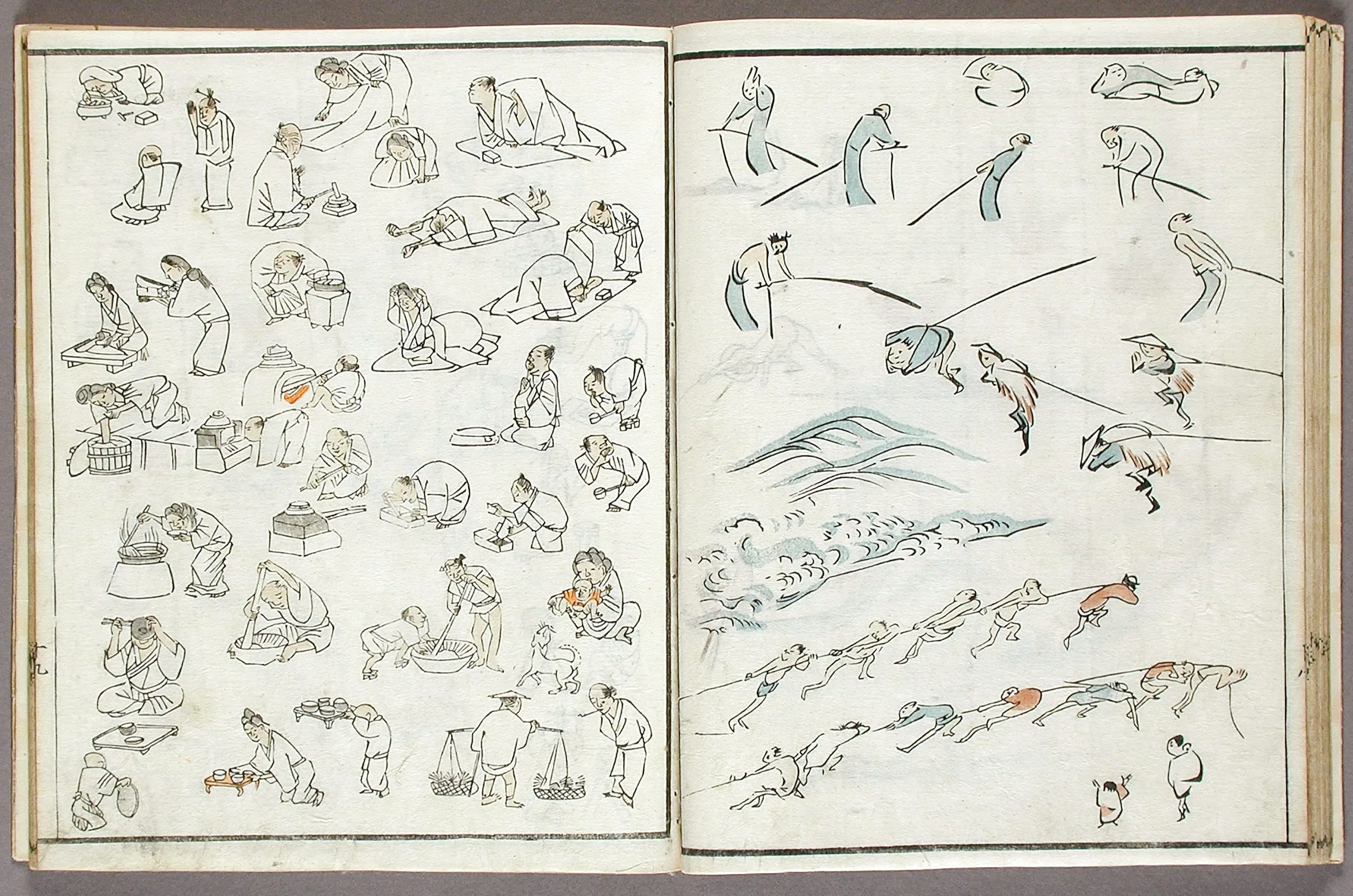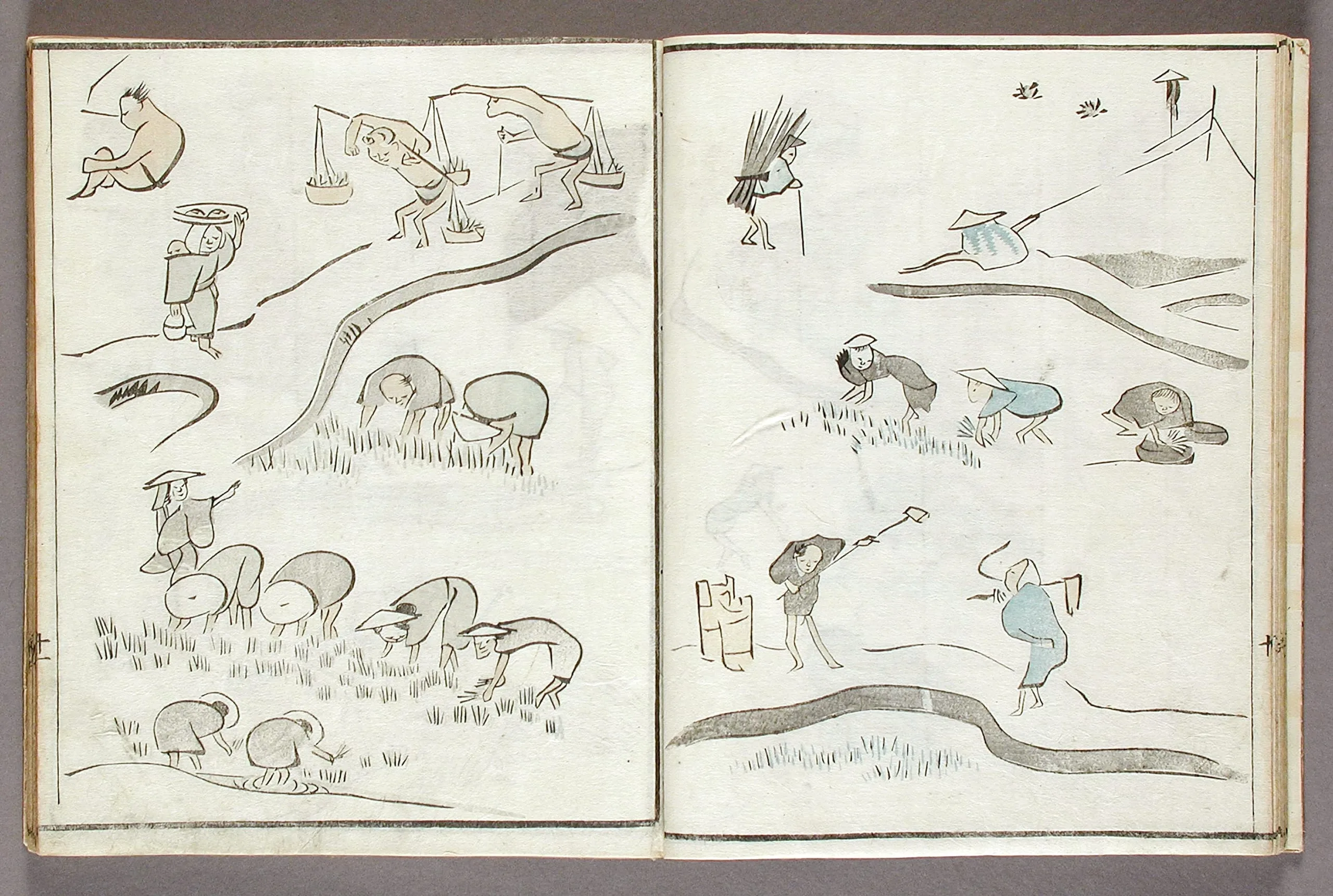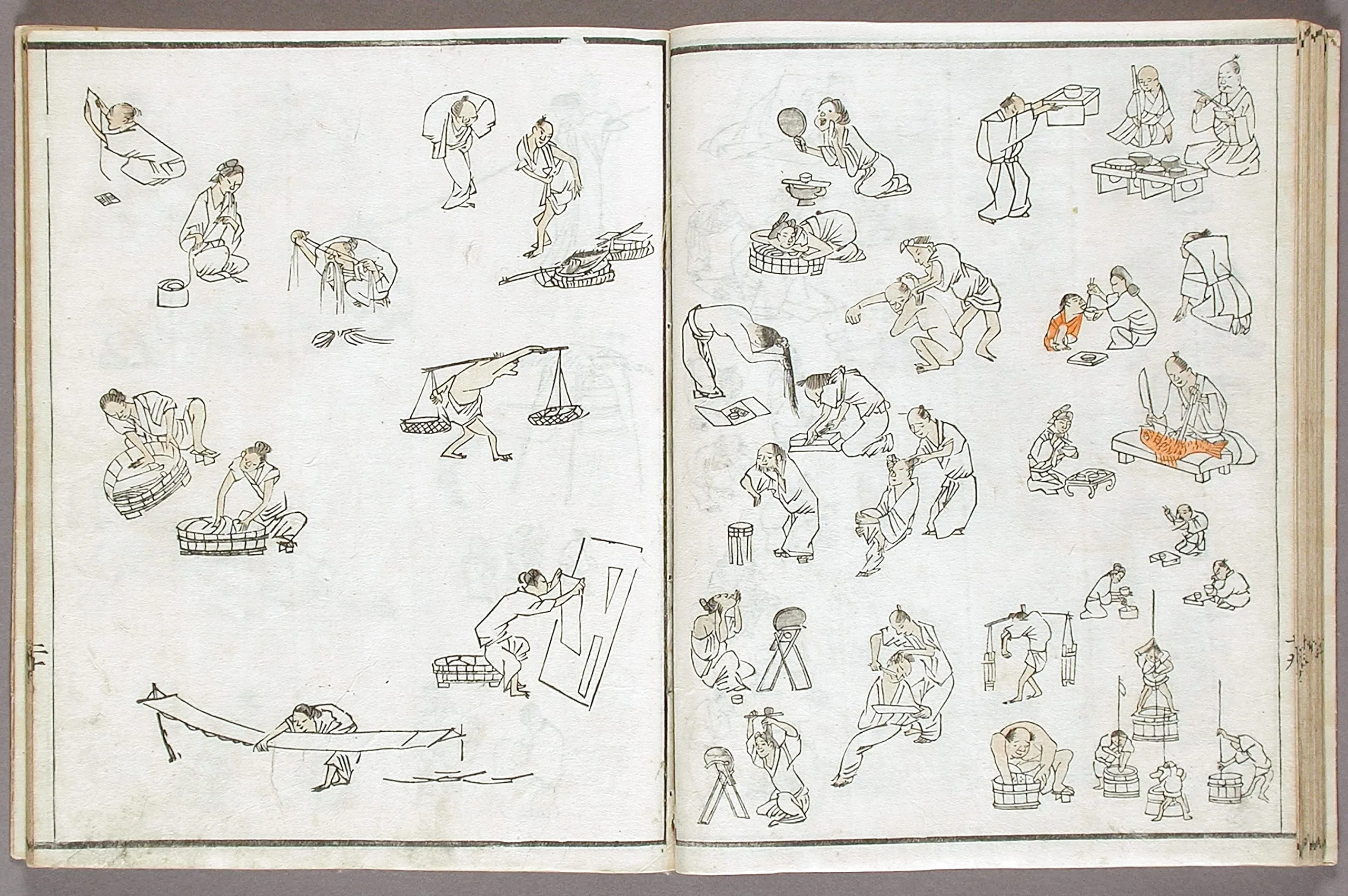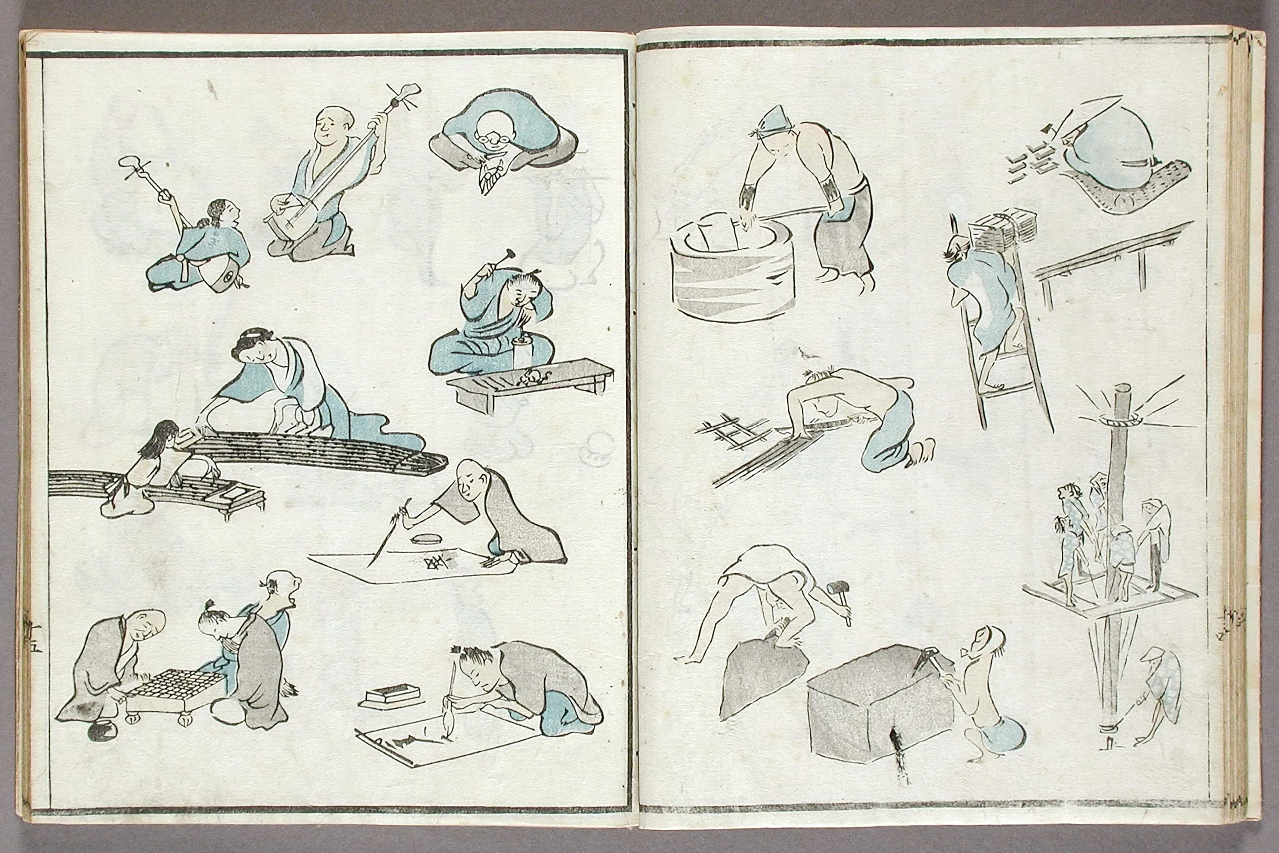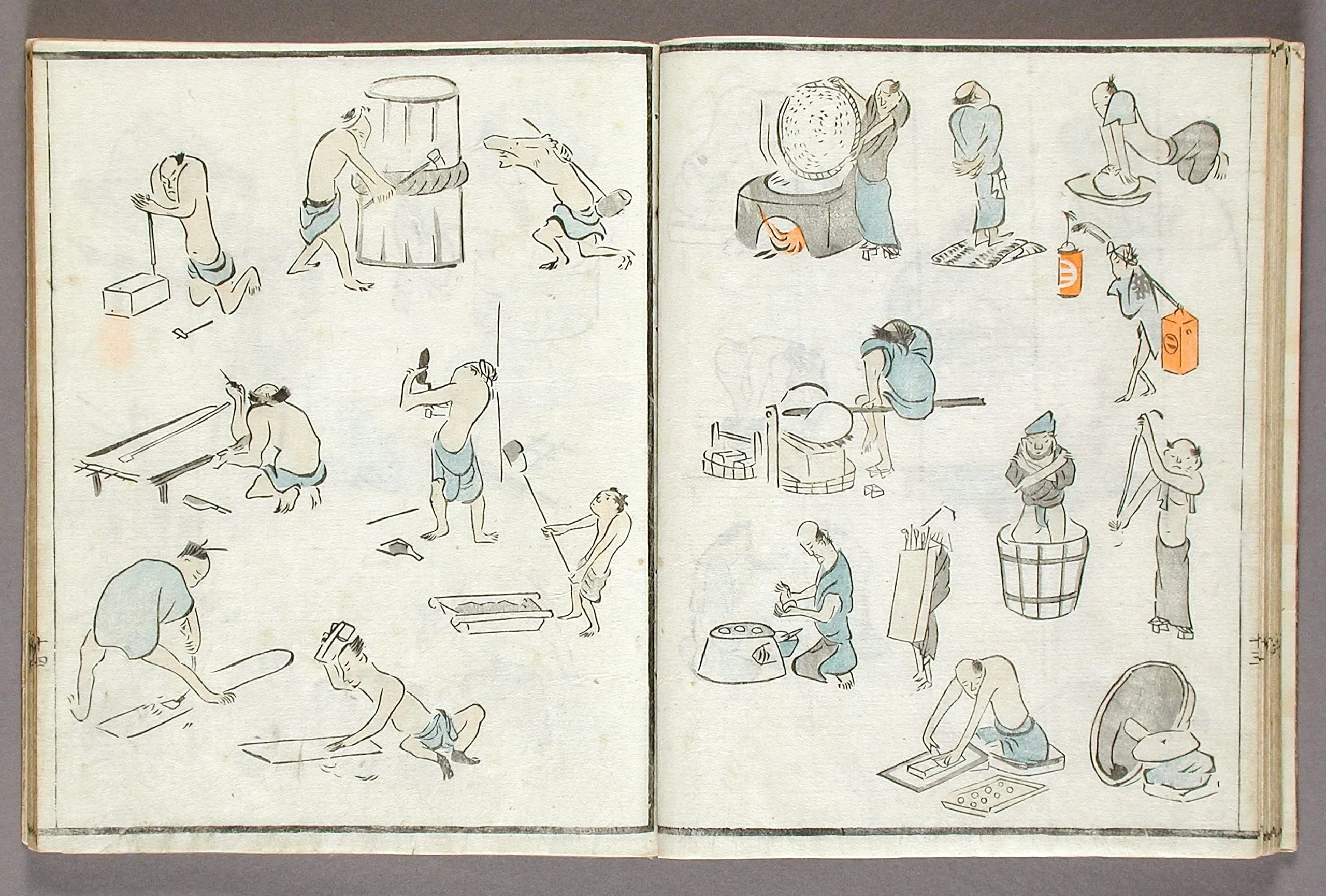 - Woodblock print book; ink and colors on paper, silk cover