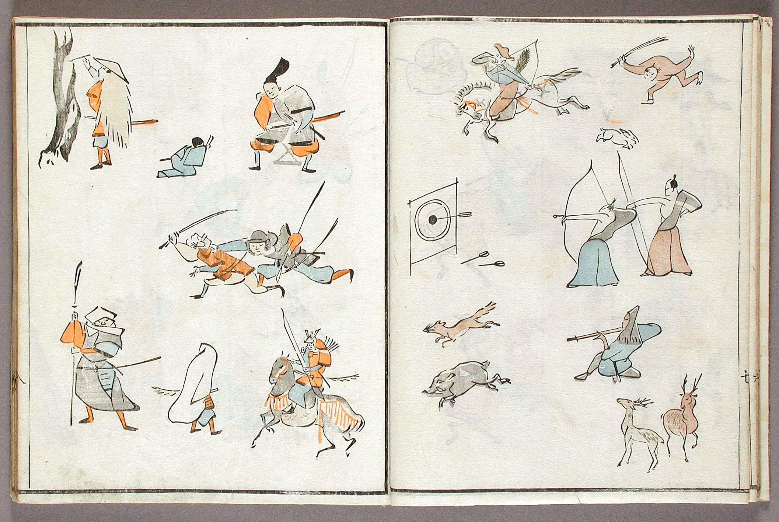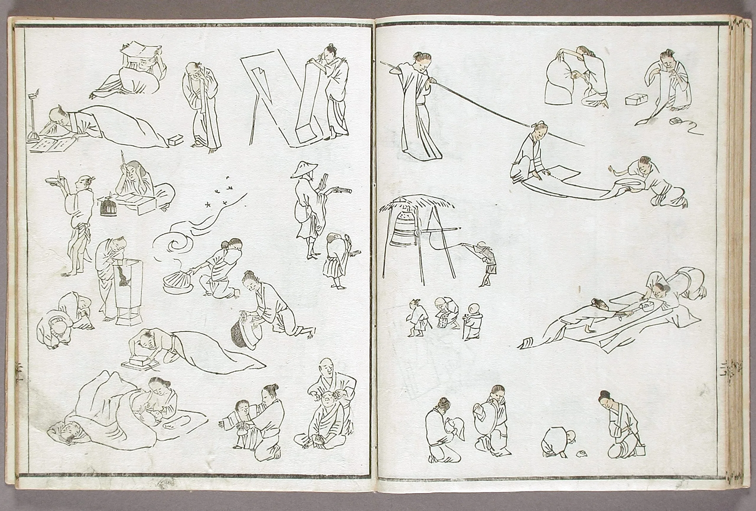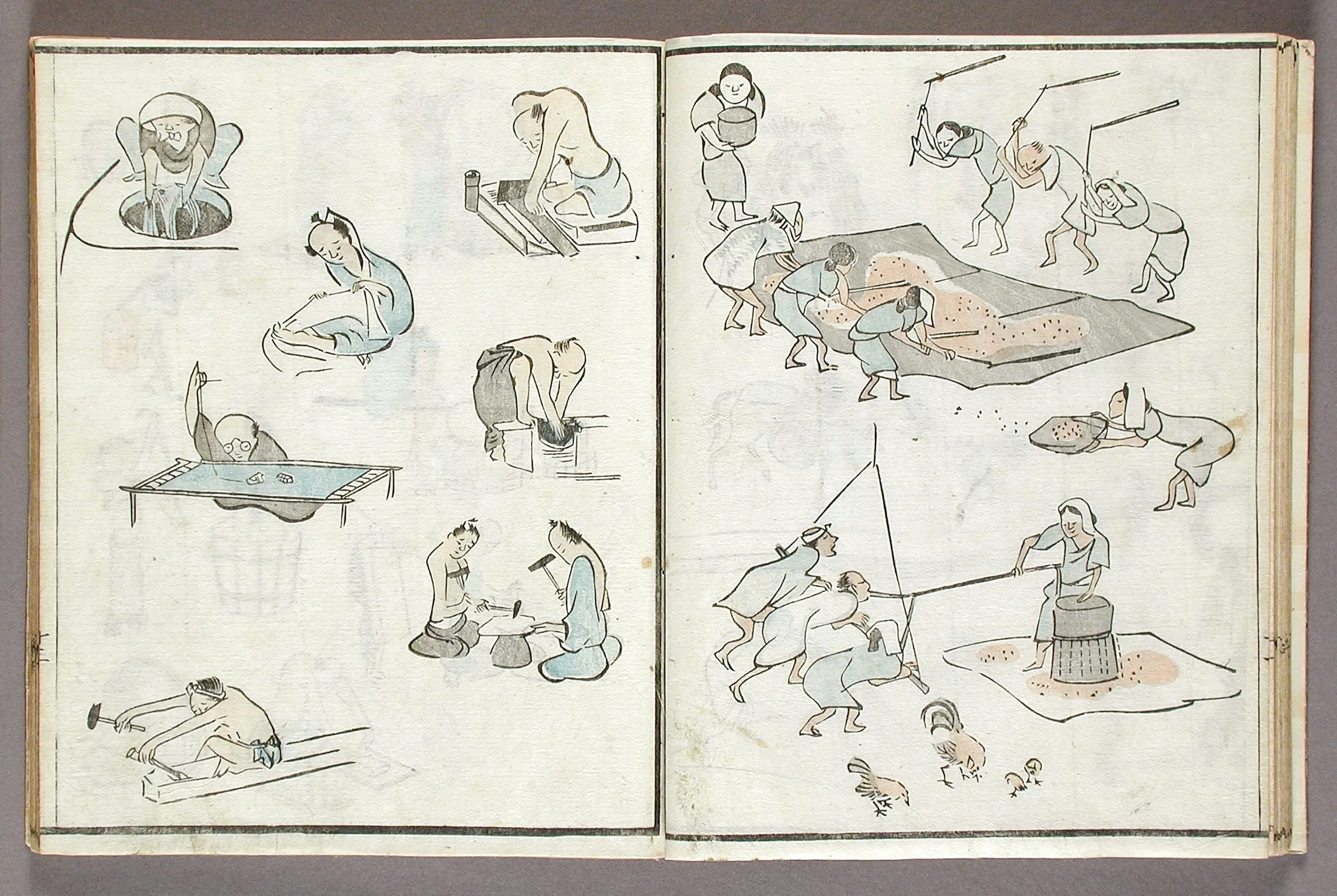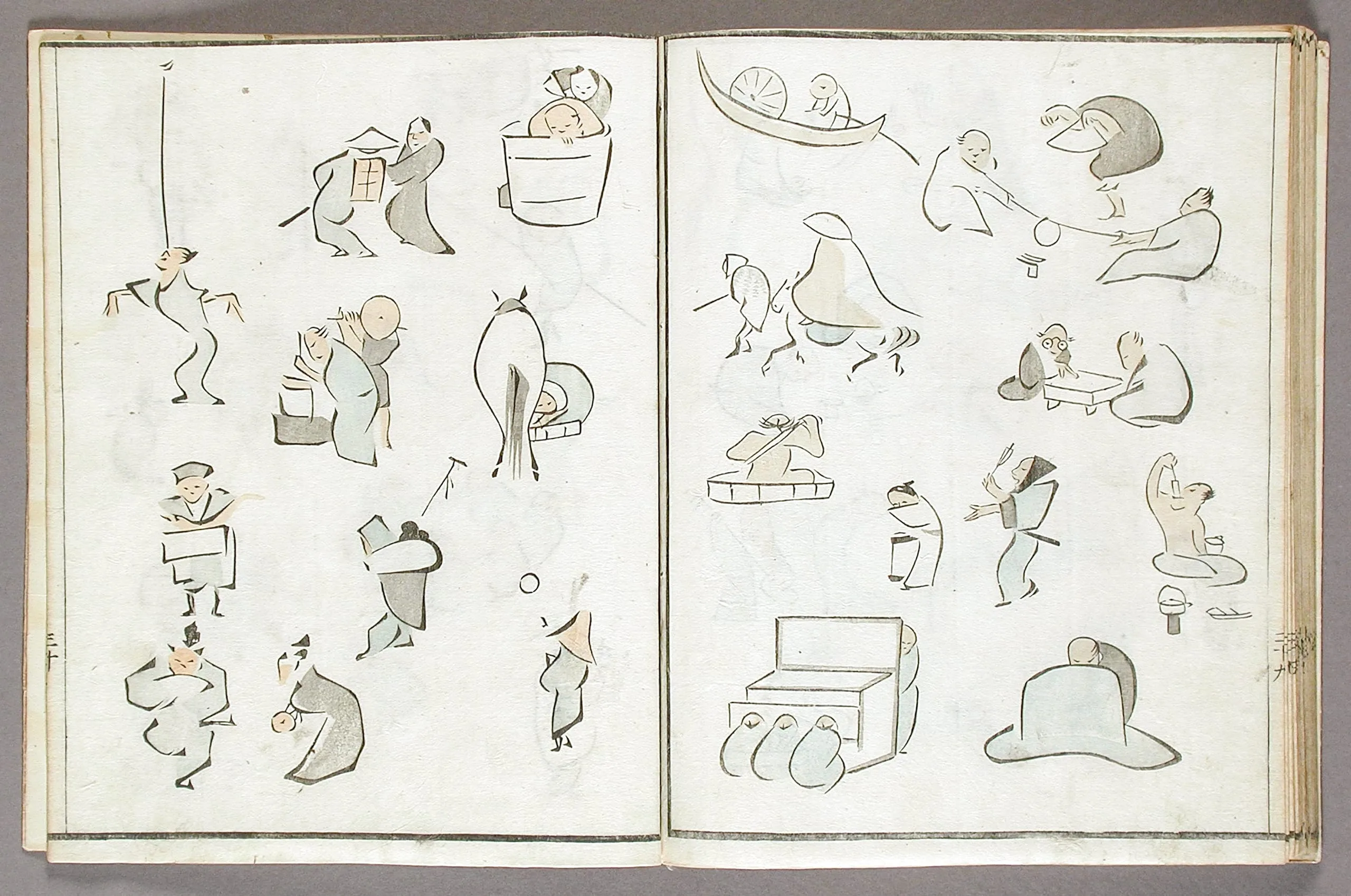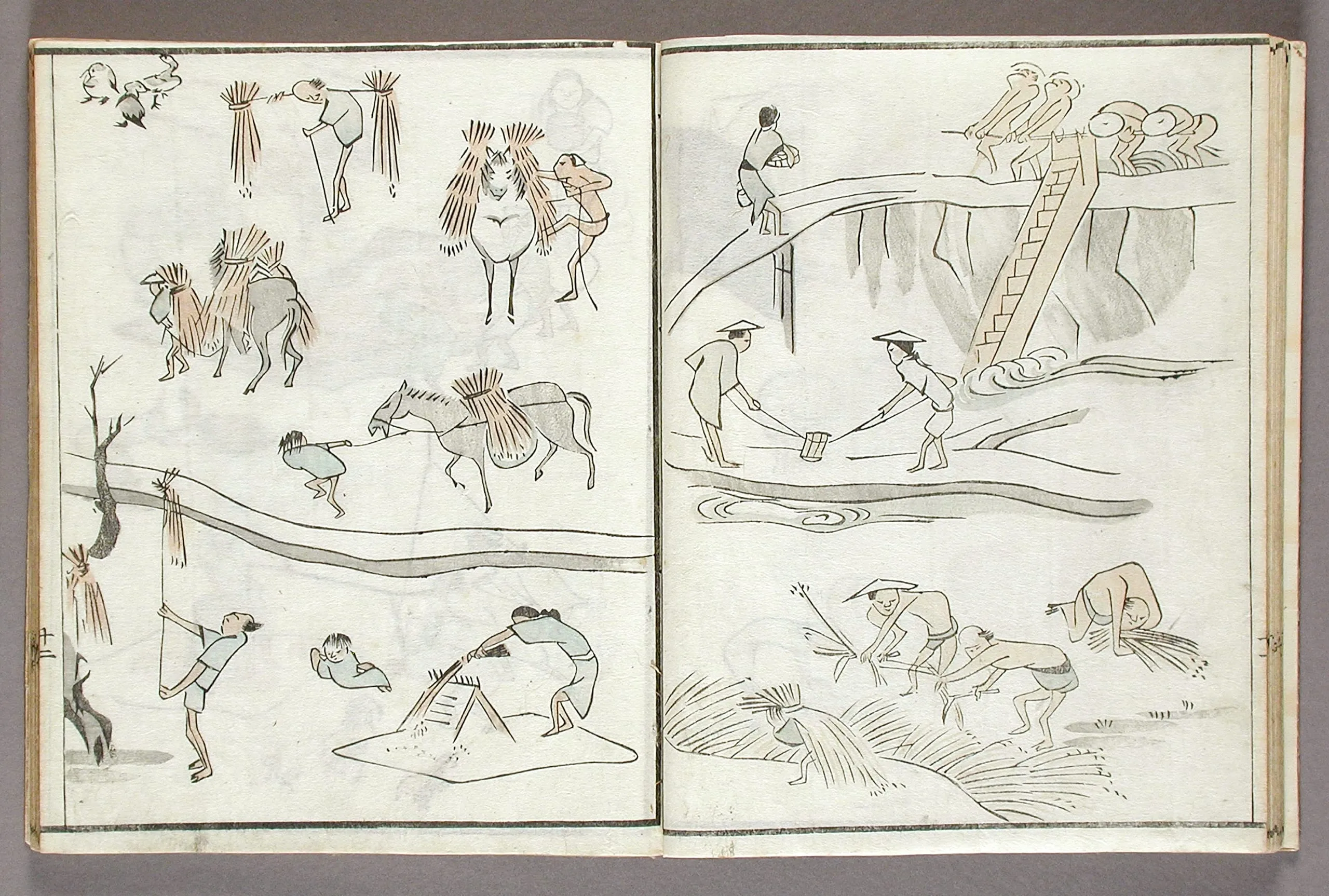 - Woodblock print book; ink and colors on paper, silk cover