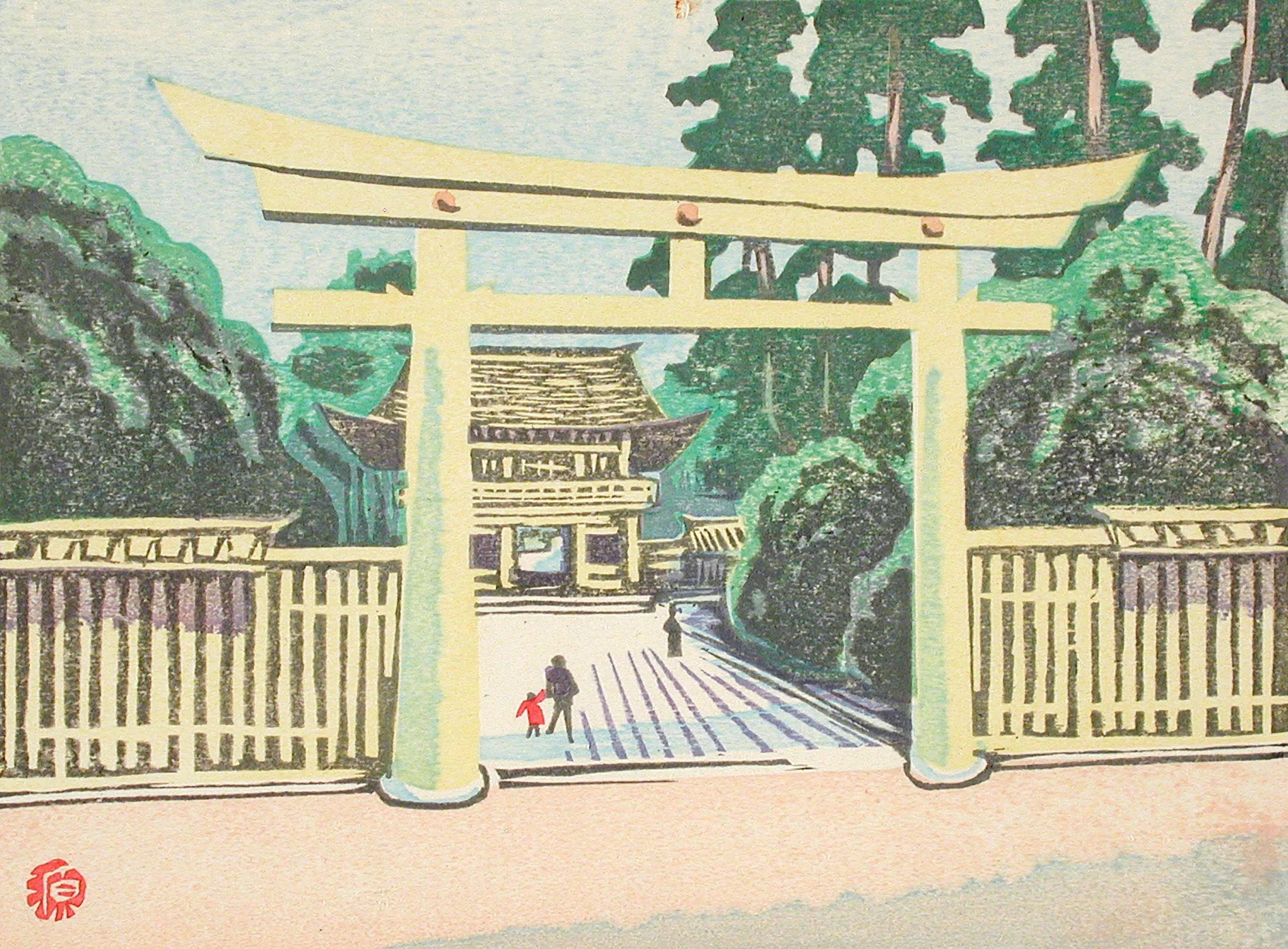 Woodblock print of a large torii gate in sage green and yellow, flanked by white fences, with small figures on a striped stone path leading to a shrine building amid dark green trees